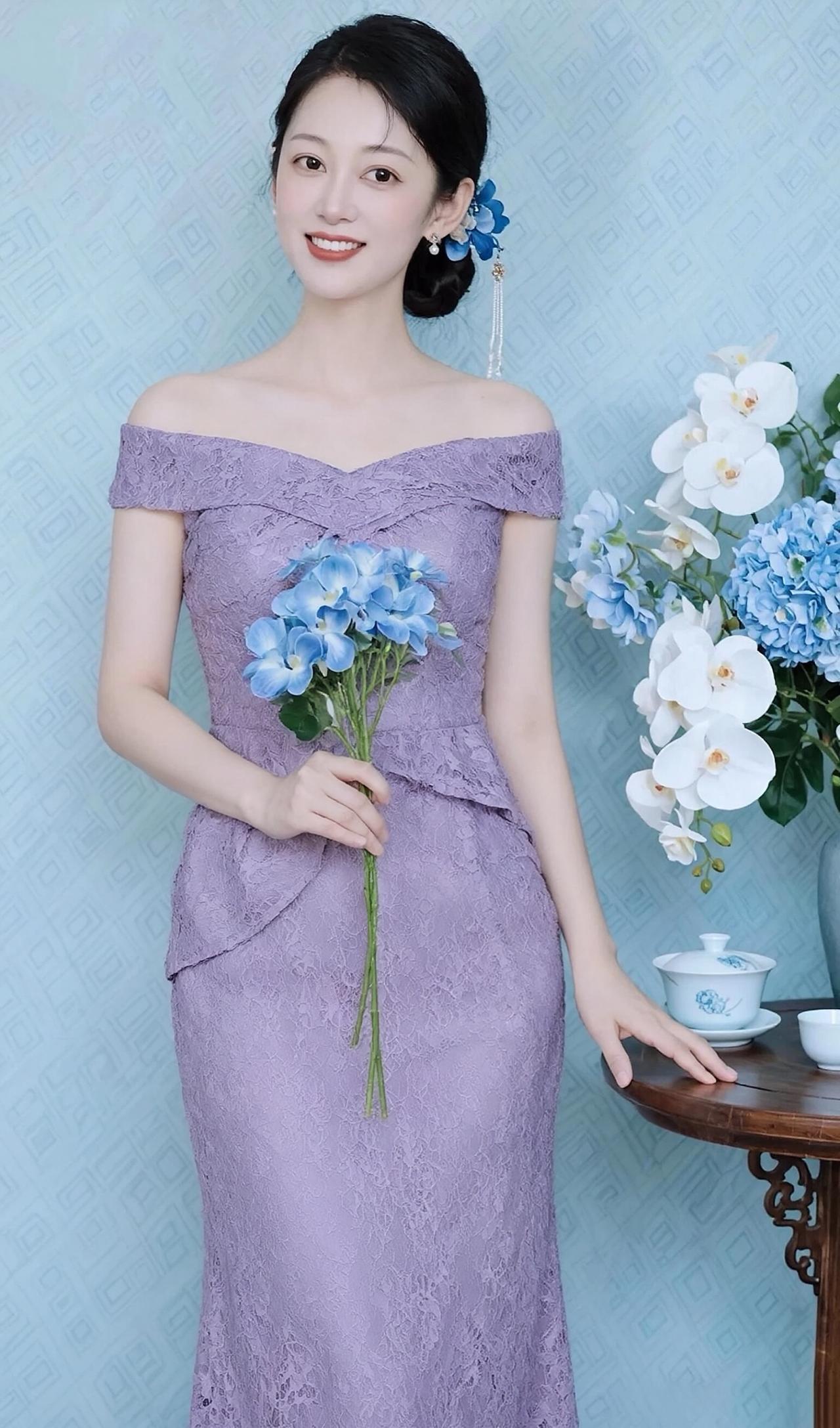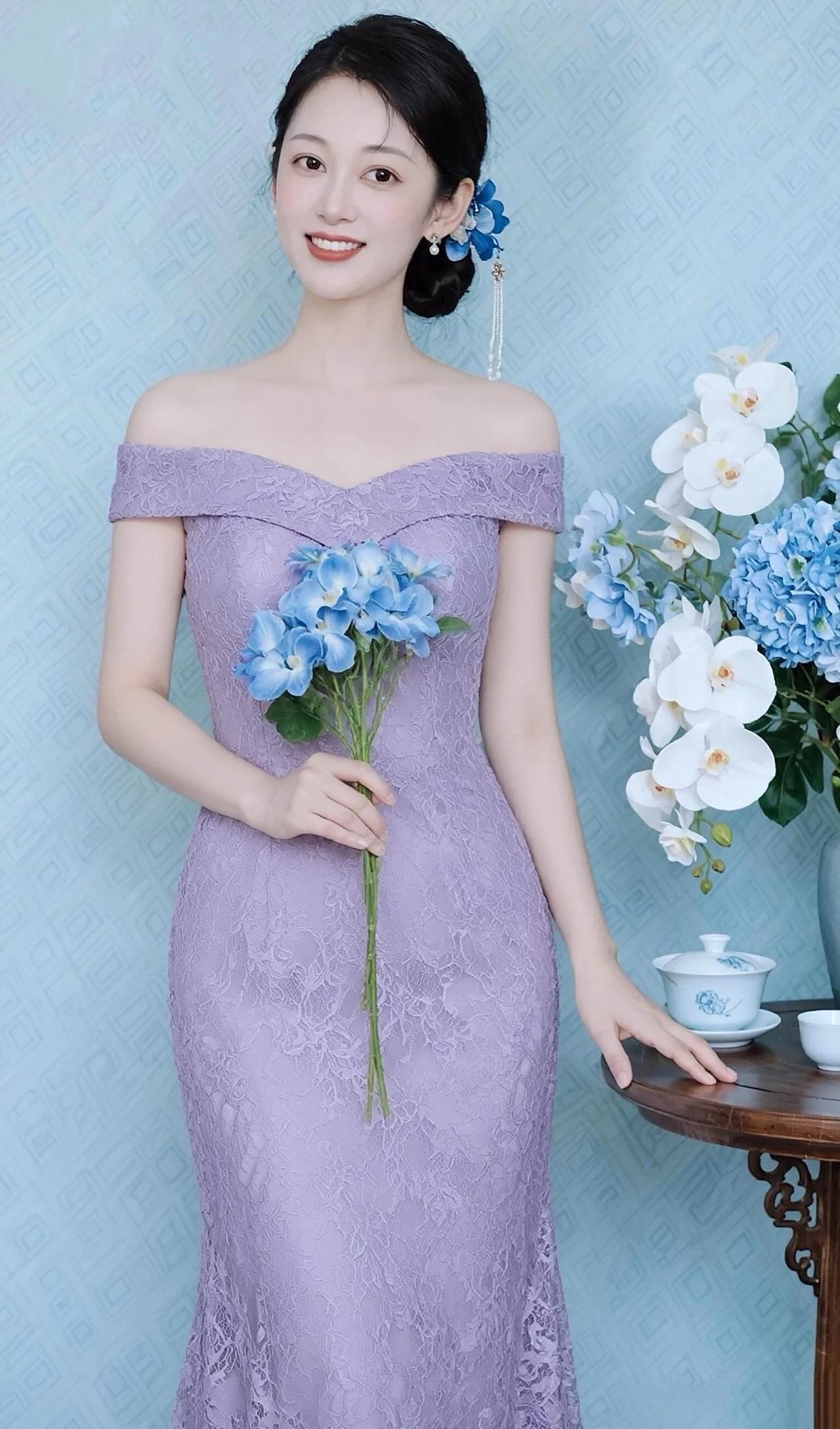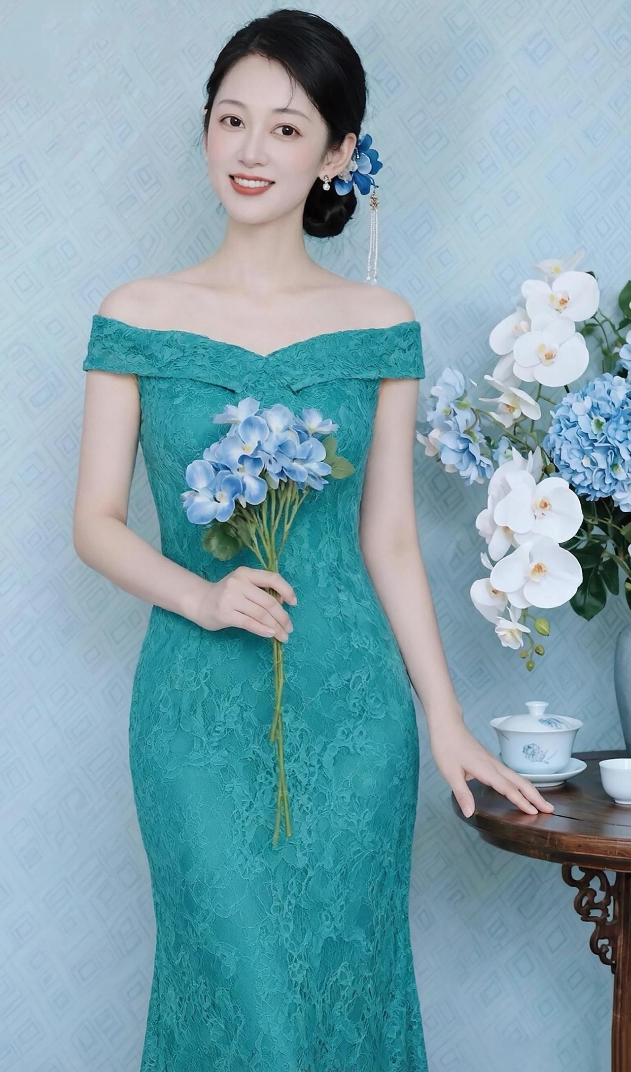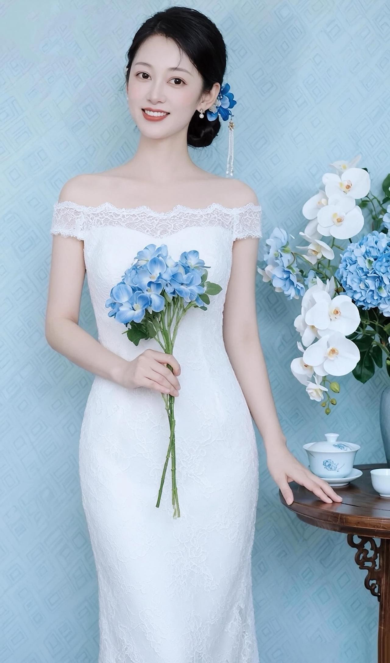 这组照片中的女子,宛如温婉雅致的东方佳人,将不同色彩的优雅演绎得淋漓尽致。 她身着多款一字肩蕾丝鱼尾裙,精致的蕾丝花纹细腻繁复,勾勒出曼妙身姿,鱼尾裙摆摇曳生姿,尽显女性的柔美与性感。一字肩的设计露出优美的锁骨与肩线,温婉又迷人。 乌黑的秀发盘起,发间点缀着蓝色花朵发饰,妆容清透淡雅,眉眼含笑,唇红齿白,笑容温婉动人。她手持一束蓝色绣球花,与背景的蓝白花艺相映成趣,清新又雅致。 从纯净的白色到温柔的浅紫,从清新的湖蓝到深邃的宝蓝,每一款色彩都衬得她肌肤胜雪,气质温婉。整体画面清新雅致,将东方韵味、优雅知性、温柔甜美完美融合,美得令人心动。