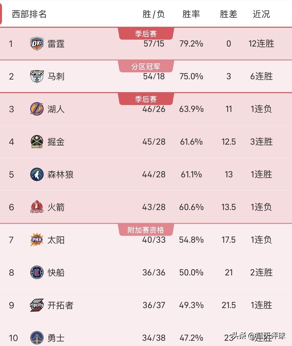 火箭最优排名:西部第六打湖人!最新阵容+对位+收视全解析 北京时间3月26日,2025-26赛季NBA常规赛收官冲刺,西部最新排名已锁定:雷霆(52-15)、马刺(54-18)、湖人(46-25)、掘金(44-28)、森林狼(44-28)、火箭(43-28)。火箭稳坐西部第六,首轮对阵西部第三湖人,是当前最理想排位——对位优势拉满、历史流量拉满、收视率预定首轮第一! 一、西部最新排名(3月26日,权威实时) 1. 雷霆 52-15 2. 马刺 54-18(西南赛区冠军) 3. 湖人 46-25 4. 掘金 44-28 5. 森林狼 44-28 6. 火箭 43-28(核心目标:守住第六) 7. 太阳 40-32 8. 快船 39-33 9. 开拓者 38-34 10. 勇士 38-34 二、休斯顿火箭 最新阵容 核心首发(常规赛主力) • 后卫:阿门·汤普森(2号)、里德·谢泼德(15号) • 前锋:凯文·杜兰特(7号)、塔里·伊森(17号)、小贾巴里·史密斯(10号) • 中锋:阿尔佩伦·申京(28号) 主要轮换(季后赛关键) • 后卫:阿隆·霍勒迪(0号)、约什·奥科吉(20号) • 前锋:多里安·芬尼-史密斯(2号)、杰夫·格林(32号)、杰肖恩·泰特(1号) • 中锋:史蒂文·亚当斯(12号)、克林特·卡佩拉(30号) 双向合同 • J.D.戴维森、凯文·哈里斯、以赛亚·克劳福德 三、洛杉矶湖人 最新阵容(3月26日,15人全) 核心首发(常规赛主力) • 后卫:卢卡·东契奇(77号)、奥斯汀·里夫斯(15号) • 前锋:勒布朗·詹姆斯(23号)、八村垒(28号) • 中锋:德安德烈·艾顿(2号) 主要轮换(季后赛关键) • 后卫:马库斯·斯马特(36号)、科比·巴夫金(3号)、布朗尼·詹姆斯(6号)、马克斯·克里斯蒂(4号) • 前锋:贾里德·范德比尔特(21号)、马克西·克勒贝尔(42号)、拉拉维亚(11号) • 中锋:贾克森·海斯(11号) 双向合同 • 科洛科、马农、小史密斯 四、火箭vs湖人:对位优势(最新阵容版) 1. 内线:火箭深度碾压湖人 • 火箭:申京(20+10+5)+ 小史密斯 + 亚当斯 + 卡佩拉 → 四人轮换、运动能力+护框+篮板全优 • 湖人:艾顿(14+10)+ 海斯 → 仅两人轮换,艾顿伤病+体能隐患大,无合格替补 • 结论:火箭内线车轮战可直接打穿湖人内线 2. 锋线/外线:火箭年轻+速度克制湖人 • 火箭:杜兰特(攻坚)+ 伊森(防守大闸)+ 汤普森(运动天赋)+ 谢泼德(投射)→ 无限换防、快攻联盟顶级 • 湖人:詹姆斯(40岁)+ 东契奇(持球大核)+ 里夫斯 → 节奏偏慢、外线三分不稳(联盟下游)、老将体能隐患 • 结论:火箭提速+高压防守,可让湖人进攻断电 3. 整体:青春风暴vs老牌豪门 • 火箭:全员年轻、冲劲足、无包袱、体能无限 • 湖人:核心高龄、战绩压力大、替补深度不足 • 结论:系列赛越往后,火箭优势越明显 五、流量+收视率:预定首轮第一 • 历史对决:火箭vs湖人是NBA经典宿敌,情怀拉满 • 球星流量:詹姆斯+东契奇(顶流)vs 杜兰特+申京(新势力) • 打法反差:快打旋风vs阵地攻坚,看点爆炸 • 结论:全美+国内直播收视率,必创本赛季季后赛首轮新高 六、结论:火箭必须守住第六 • 冲前五:首轮打掘金/森林狼,内线硬碰硬,胜率极低 • 掉第七:打附加赛,伤病+体能风险陡增 • 守第六:首轮打湖人,对位优势+流量双赢,是当前唯一最优解 常规赛收官战,火箭只需稳住战绩、锁定西部第六,即可迎来最理想的季后赛开局。青年军vs豪门巨星,这场对决注定引爆全网!