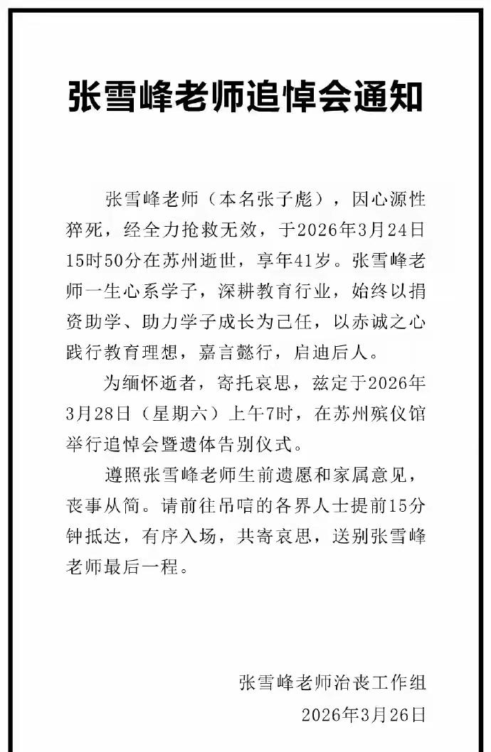 张雪峰老师的追悼会,将于3月28日上午7时在苏州殡仪馆举行,张老师生前的遗愿是让一切从简,不想占用太多社会公共资源! 到时候肯定会有很多人前去送张老师最后一程的,别的不说,就是这些年他帮助过填写大学志愿的学生,帮助过的考研成功上岸的学生,都会从全国各地自愿前往苏州,来送车张老师的! 张雪峰老师,虽然从事的是线上教育咨询事业,但是,他却把大多数家长和学生都搞不明白的事情,用最通俗易懂的语言,说明白了。也让大家知道了,上大学选专业的重要性,知道了选择往往比努力更重要的道理!