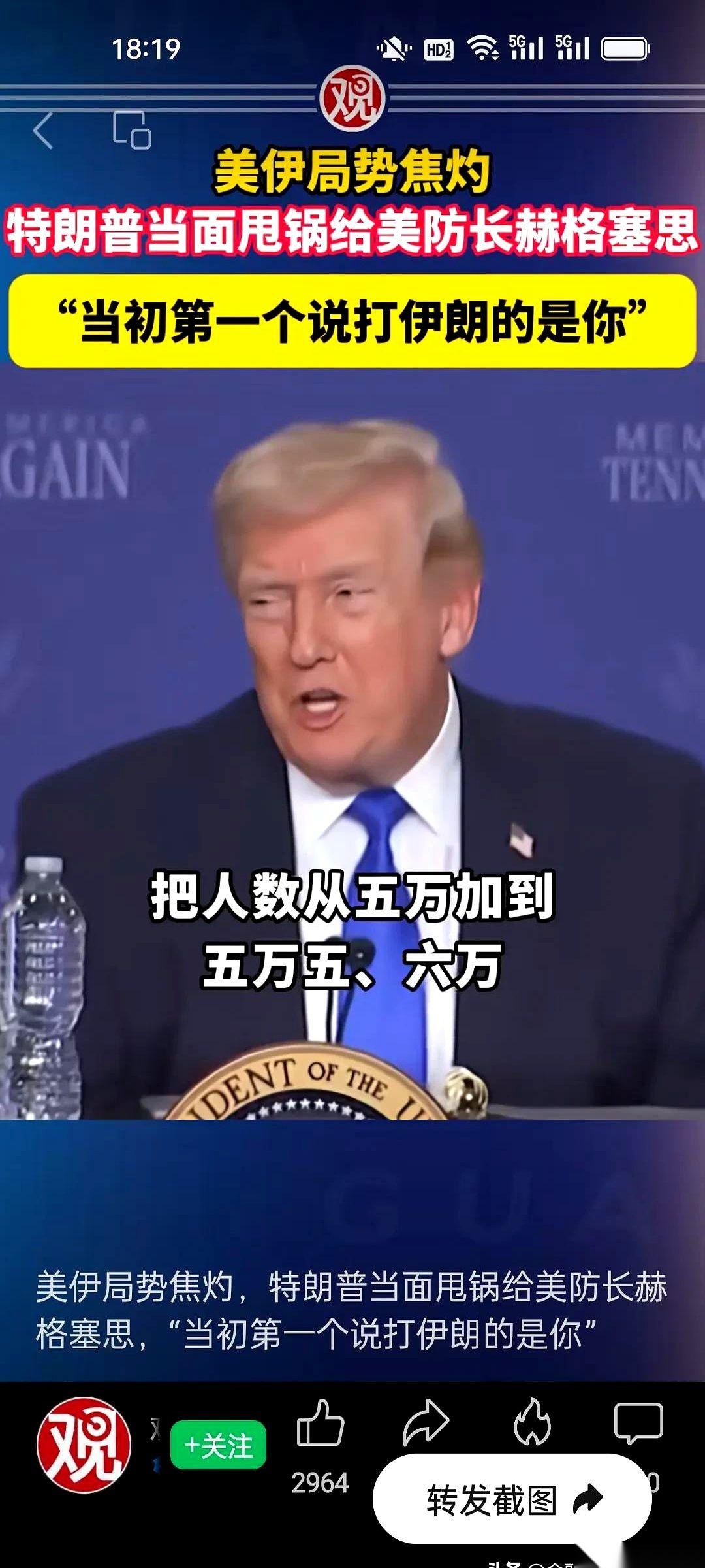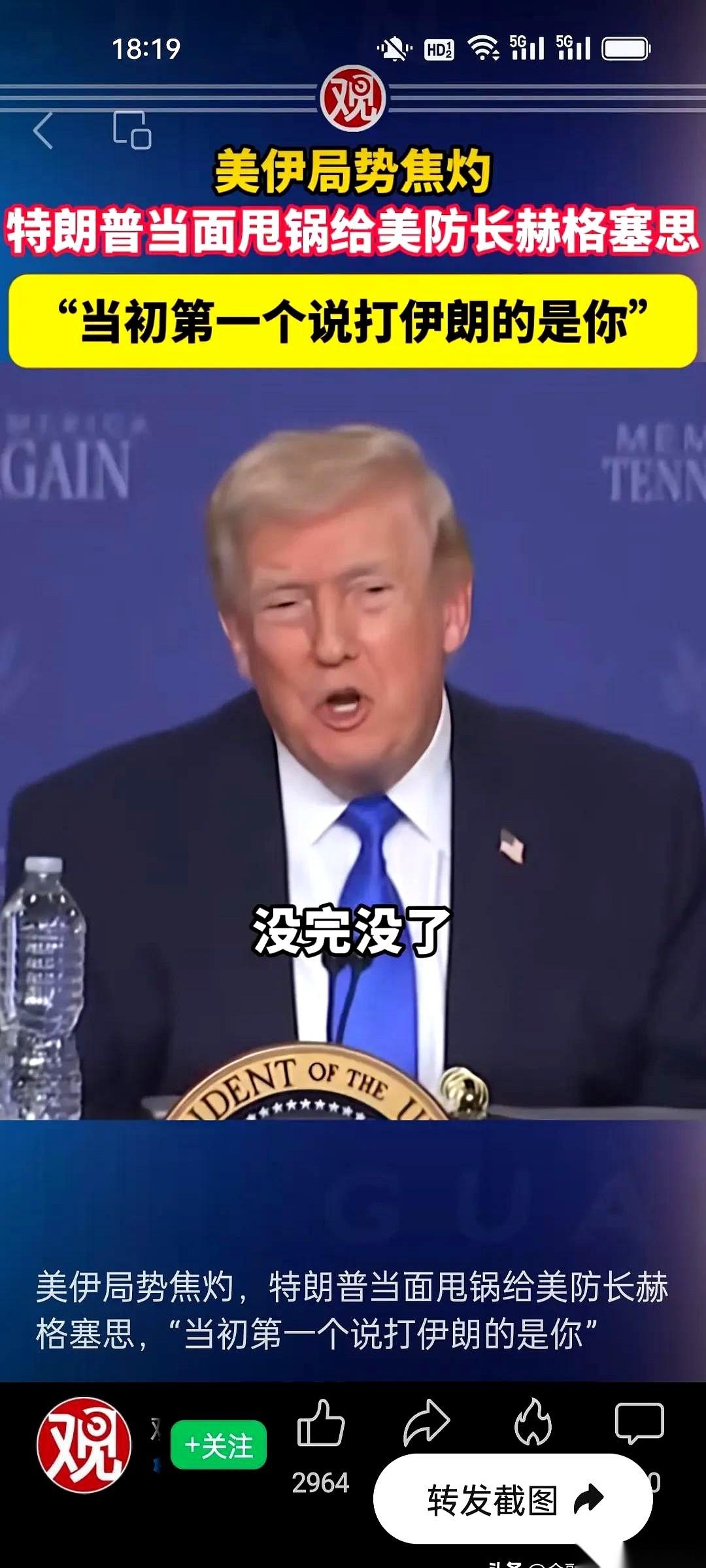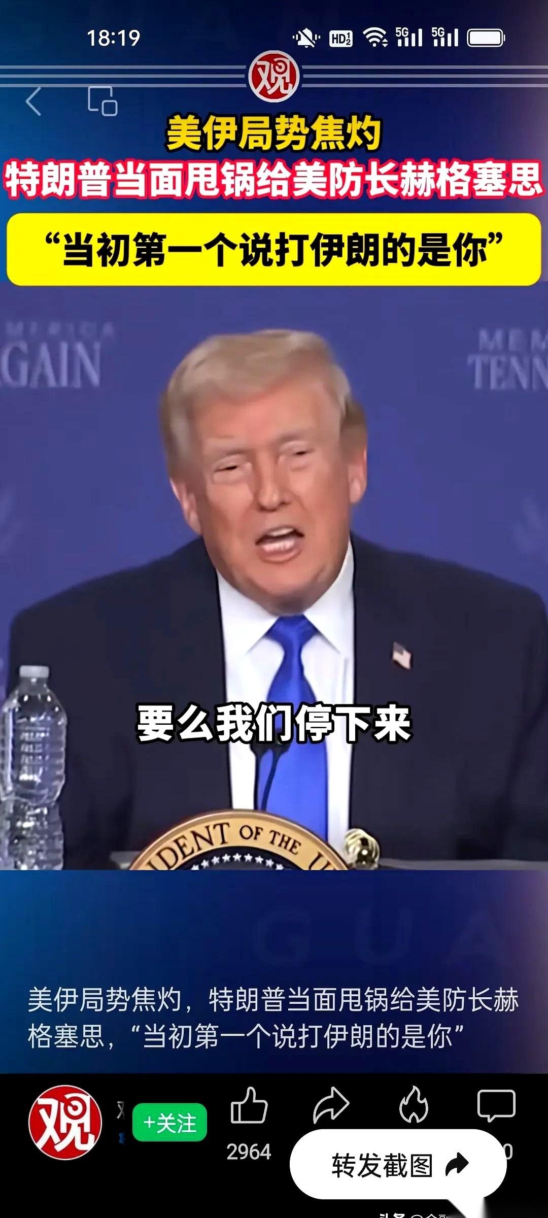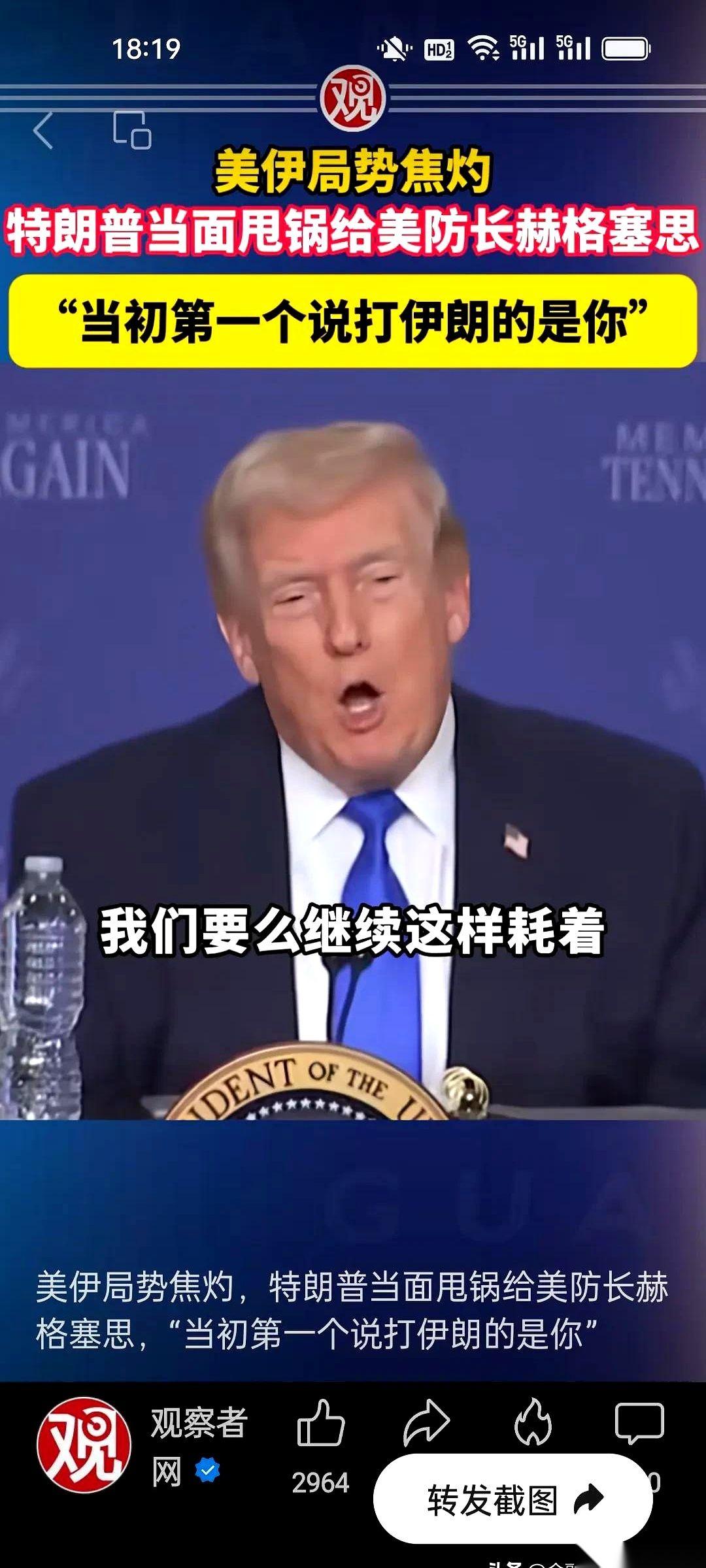 特朗普这回真急了。 仗打了25天,230亿美元扔进中东,水花都没见一个。他在田纳西州的一场会议上,当着所有人的面,直接把国防部长赫格塞思推了出来:“当初,是他第一个说要动手的!” 整个会场一下就安静了。 他对着镜头,一字一句地把责任推得干干净净,仿佛那个拍板决策的人,根本不是他自己。而赫格塞思,就成了那个唯一需要为这230亿美金埋单的人。 现实是什么? 每天烧掉10亿军费,一分钱报销都没有。前线的军官报告说,伊朗的导弹快要拦不住了。 战略好处?半点没有。 甩完锅,立马转向。周一早上七点,他就开始到处放风,说美国“非常有诚意”跟伊朗坐下来谈个协议。 说白了,功劳都是自己的,账单得别人付。
