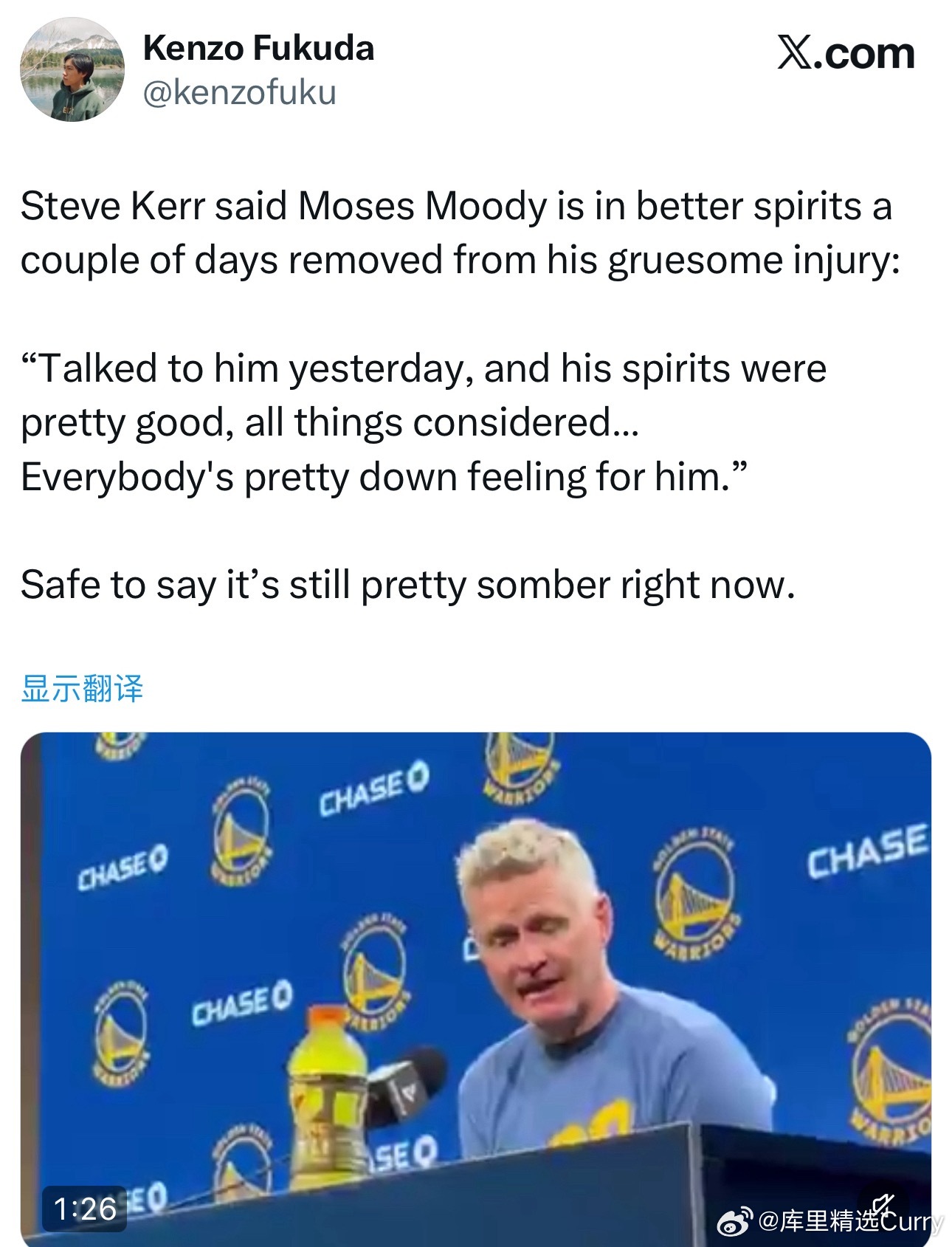 科尔表示穆迪在遭受重伤几天后,精神状态好转了很多: