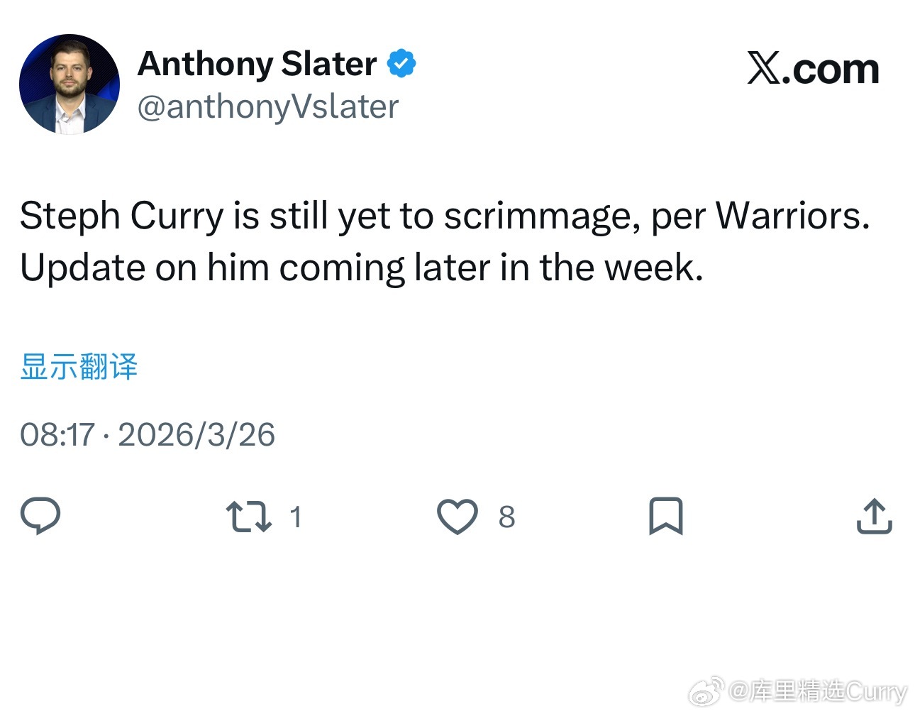 据勇士消息,库里目前仍未参加队内对抗赛。本周晚些时候将发布关于他的最新消息。