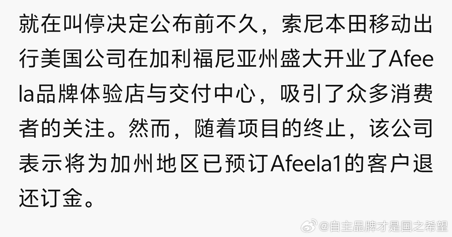 索尼和本田合作的电车afeela项目黄掉了就像他们的隐形飞机“心神”黄掉了一样像一条野狗一样死在路边,无人在意。这个车我在东京车展看了,当时还等这两家发力呢,结果竟然是无果而终。日本今天工业电气化 智能化基础都太差了ppt都是落后的各种新项目搞一个黄一个。