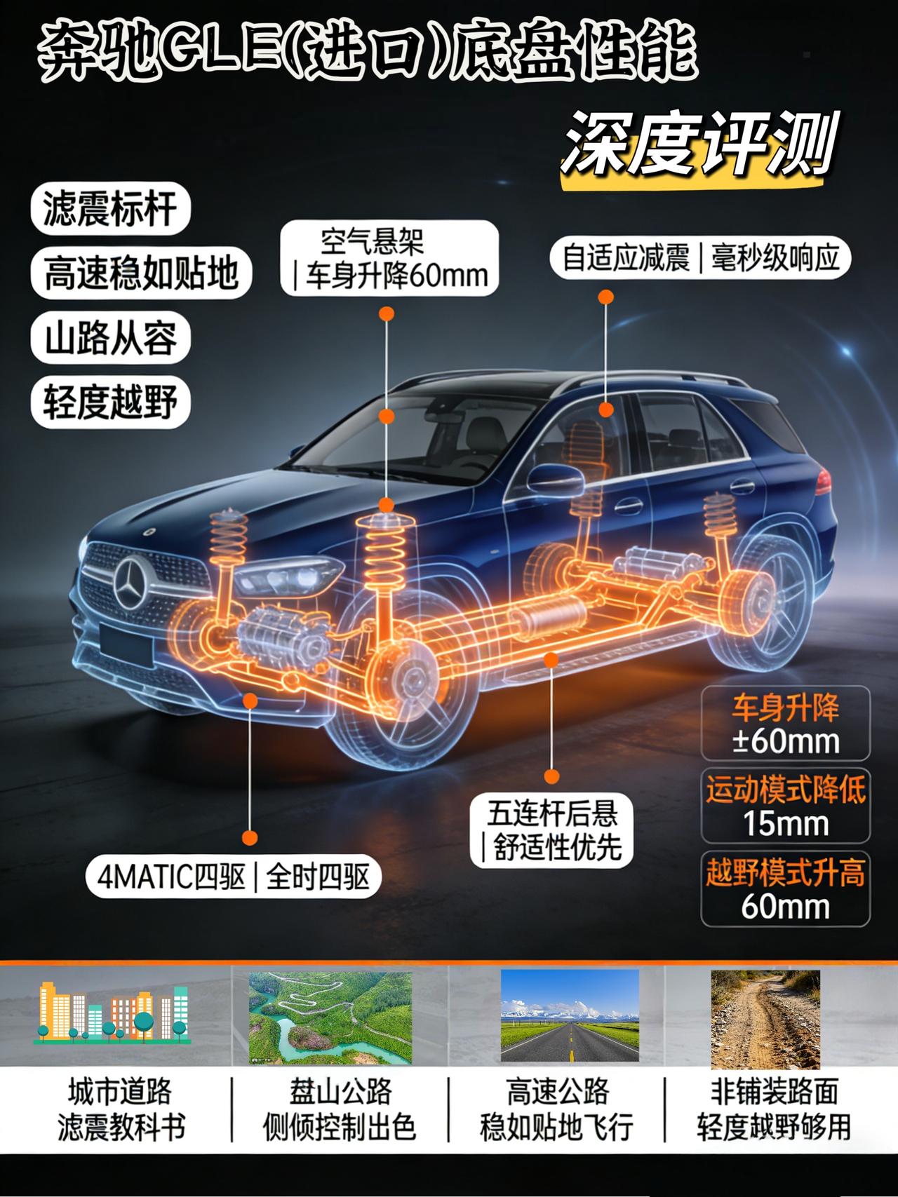 奔驰GLE(进口)底盘性能深度评测 在豪华中大型SUV市场,奔驰GLE一直是个特殊的存在。它不像宝马X5那样强调操控,也不像奥迪Q7那样主打科技,更不像保时捷Cayenne那样追求运动。奔驰给GLE的定位很明确:舒适至上,从容为先。而实现这一目标的底层核心,正是它的底盘。 提车一周,我开着这台GLE 450 4MATIC跑过城市快速路、坑洼国道、盘山公路和高速长途,今天只聚焦一个维度——底盘性能,聊聊这套底盘在不同路况下的真实表现。 硬件底子:空气悬架+自适应减震是灵魂 GLE底盘最大的技术亮点,是全系标配的空气悬架系统。这套系统可以根据车速、路况和驾驶模式自动调节车身高度和减震阻尼。在舒适模式下,悬架处于最软状态,车身高度为标准值;切换到运动模式,车身自动降低15mm,减震阻尼变硬;越野模式下,车身可升高60mm,获得更大的接近角和离去角。 另一个重要硬件是自适应减震系统。这套系统通过传感器实时监测车身运动、车轮跳动和转向输入,毫秒级调整每个车轮的减震阻尼。理论上,它既能吸收路面颠簸,又能在过弯时提供足够的侧向支撑。 但理论归理论,实际开起来到底如何? 城市道路:滤震能力堪称教科书级别 先说说市区日常通勤的场景。我特意找了一段布满井盖、减速带和路面补丁的国道,这是考验滤震能力的绝佳场地。 在舒适模式下,GLE的底盘表现可以用“熨烫”来形容。碾过井盖时,车身几乎没有任何冲击感传递到座椅,你能感知到车轮压过了什么东西,但那种生硬的撞击感被完全隔离在底盘之下。更让我意外的是处理连续颠簸路面的能力——当路面出现密集的破损和补丁时,悬架依然保持着从容的节奏,没有出现任何慌乱或多余的弹跳。 减速带是另一个检验标准。以30km/h通过减速带时,前轮压上去的一瞬间有轻微缓冲感,后轮通过时几乎察觉不到多余的余震。整个动作干脆利落,车身没有出现任何横向晃动。这种高级感是GLE底盘最打动人的地方——它不是在刻意隔绝路感,而是把路面信息“翻译”成一种你能接受的方式传递给你。 山路攻弯:空气悬架的两面性 把GLE开上山路,才是真正考验底盘功底的时候。我选择了一段连续S弯居多的盘山公路,驾驶模式切换到运动。 车身自动降低15mm后,悬架明显变硬。入弯时,车头有轻微的俯仰,但侧倾控制得比预期要好得多。以60km/h左右的速度过中等半径弯道,车身姿态依然稳健,内侧悬架没有被压缩到极限的感觉。这在自重超过2.2吨的SUV里,已经是非常出色的表现。 但GLE终究不是为劈弯而生的。连续快速重心转移时,底盘的反应速度会稍显迟缓——方向盘打过去,车身需要零点几秒来响应。这种延迟不是转向不足,而是悬架在物理极限下的“思考时间”。 高速巡航:稳如贴地飞行 高速是GLE底盘最舒适的工况。车速稳定在120km/h,空气悬架会自动降低车身,减少风阻和重心高度。路面接缝和细微起伏被完全抹平,车内几乎感受不到任何来自路面的干扰。经过桥梁接缝时,底盘会发出沉闷的“砰砰”两声,车身没有任何起伏。 更值得一说的是高速变道。快速并线时,车身侧倾被控制得很好,没有那种“晃一下”的感觉,整个动作一气呵成。这种稳定性来自于自适应减震系统的快速响应——当你转动方向盘的那一刻,外侧减震器已经提前加硬,为车身提供支撑。 非铺装路面:轻度越野的真实体验 GLE毕竟是一台SUV,不能只跑铺装路面。我找了一段碎石路和轻度土坡,体验了它的越野能力。 将驾驶模式切换到越野模式,车身升高60mm,悬架阻尼变软,允许更多的车轮行程。在碎石路上,底盘表现出很强的隔绝感——碎石敲击底盘的声音被有效隔离,车身的颠簸幅度被控制在很小的范围内。通过交叉轴路况时,4MATIC四驱系统能迅速锁止打滑车轮,把动力分配到有附着力的车轮上。 不过需要说明的是,GLE的空气悬架虽然能升高车身,但它的本质还是偏向公路舒适。重度越野不是它的定位,偶尔走个烂路、上个马路牙子完全够用,真要玩泥巴、爬石头,还是交给G级更合适。 总结:豪华SUV的底盘标杆 奔驰GLE的底盘,是一套为“舒适”二字极致优化的系统。空气悬架加自适应减震的组合,让它具备了顶级的滤震能力和行驶质感。在城市道路上,它的底盘表现堪称教科书级别;在高速上,它的稳定性和隔绝感让人安心;在山路上,它用从容而非激进的方式应对弯道。 当然,这套底盘也有取舍——转向手感偏轻、路感不够直接,但这些所谓的“缺点”,恰恰是GLE目标用户群体所不需要的。买GLE的人,要的是从容不迫的行驶质感,是家人坐在后排不会被颠醒的舒适体验,是长途自驾时的那种轻松感。 从这一点来说,GLE的底盘做到了它该做的一切:让你在不知不觉中,走完一段又一段的路。【来自懂车帝车友圈】