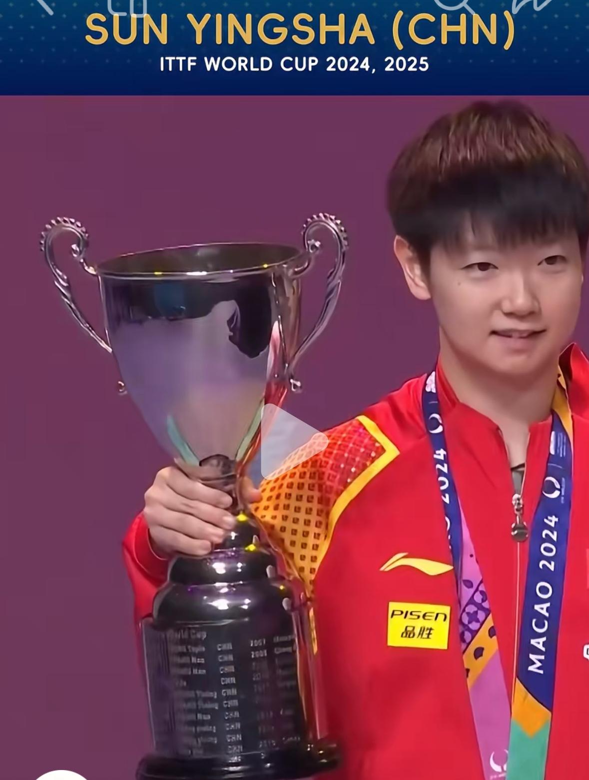 ITTF更新:孙颖莎2024 2025届世界杯双冠军加身! 2026年澳门世界杯, 孙颖莎将再次站在世界杯的赛场上, 目标只有一个, 夺取2026年世界杯第三座冠军奖杯🏆,她能否再次问鼎, 续写辉煌? 孙颖莎估计没有说过2026年世界杯 目标夺冠, 这个一定是世界乒联的宣传, 以孙颖莎以往发言, 一定会说, 一分一分的打, 一场一场的拼, 专注投入到每一场比赛, 不设定目标, 而且来参加世界杯的每一位选手都非常优秀,希望自己走的更远! 世界杯倒计时4天, 国乒27日出征世界杯, 29日抽签, 莎莎加油!