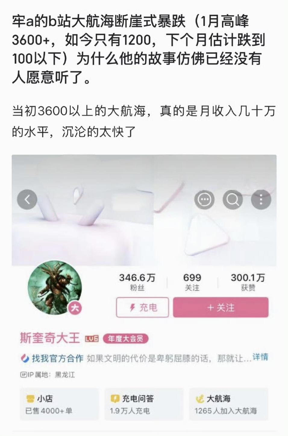 牢a的b站大航海断崖式暴跌(1月高峰3600+,如今只有1200,下个月估计跌到100以下)为什么他的故事仿佛已经没有人愿意听了