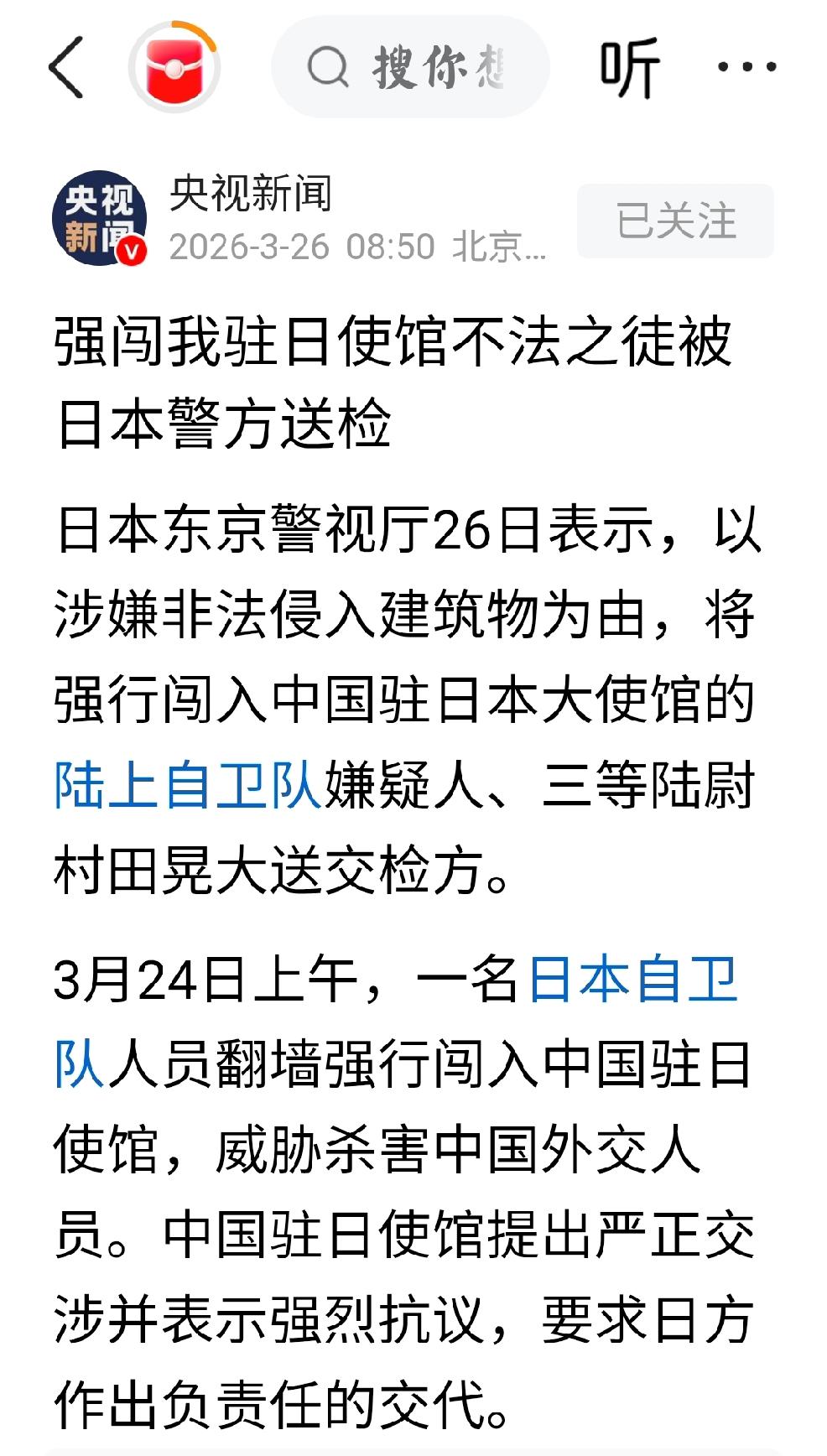 3月26日,央视新闻发文:“强闯我驻日使馆不法之徒被日本警方送检” 个人认为:密切关注日方的动态,这是非常有必要的高度警觉的态度。 现在的日本人以及当下的日本政府处于一种极度危险情况之中。 需要警惕当下的日本政府突然如疯狗一般的侵略,一边警惕防备,一边是非常需要压缩日本的国力。 因为现在的日本再度军事化,再度武装化,企图再度侵略化。