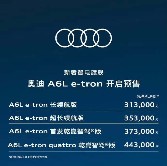 4严重低估市场,迪子其实在BBA里面喊转型,喊电动化最早,但走的最慢,甚至至今没有任何一款爆款电车,除了定价不看市场,有傲气,还是有情绪在之外,新势力们同学们太优秀,你可以理解,外面市场上每天血雨腥风的pk,但迪子这里风平浪静,还在坚持靠单一油车路线推进,电动化进程就慢了,时间一长,压的它根本没有解决办法,早前靠跟华为联名想赚点关注,但到现在为止,真的几乎没有咋看出来?比如第一次尝试,是在A5L上还提供有专门的乾崑智驾版本,但因为匹配问题,延误了交付时间,后期装车单量极低,到Q5L上的时候直接变成了全系选装,再到这两天上的燃油版A6L,直接就全系不提供了!连选装的权利都抹了,或许,迪子又有新想法了,还是在变,在想,只有纯电版A6L才有乾崑智驾版,这样,对市场,讨不到半点便宜,算是跟华为乾崑合作但完全没沾上华为光的品牌;加上看到纯电A6L这个预售价格,真的没看出来,它出来干嘛,想做什么,800V、5C、辅助驾驶能力、可玩性、自己特点、怎么在众多车里有自己特色,都是考点,在中国想卖好纯电车,不能发了就拉倒,要有特色,你总不能一直聊quattro,一直聊品牌,一直聊情怀吧,在完全没声量的情况下,往后上市,会更加难,你想啊,前期都没人看,那上市以后………
