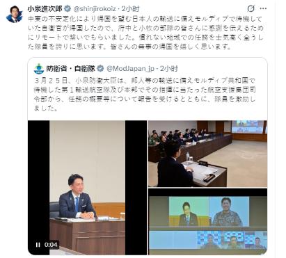 日本把态度表明了,近期日本防卫大臣小泉进次郎在社交媒体上称赞日本自卫队。 他发文表示自卫队把中东的日本公民安全的送回国内,自己很高兴他们能平安归来,还对他们感到骄傲。 在放在以前可能没什么,但是就在近期发生了自卫队军官闯入中国大使馆的恶性事件,而小泉进次郎对此没有发表任何道歉声明。 但是现在他又在另一件事表扬了自卫队,其实他们的想法我们已经知道了,就是默认了自卫队军官的行为,现在就看一看中国的反应。 现在可以确定一件事,日本以前要对中国发难还要遮遮掩掩,事后还要找补,但是现在他们根本就不背着人了,现在选择无视,以后就可能会支持这种行为。 我们必须要提高警惕,不知道大家有什么看法,评论区聊聊。