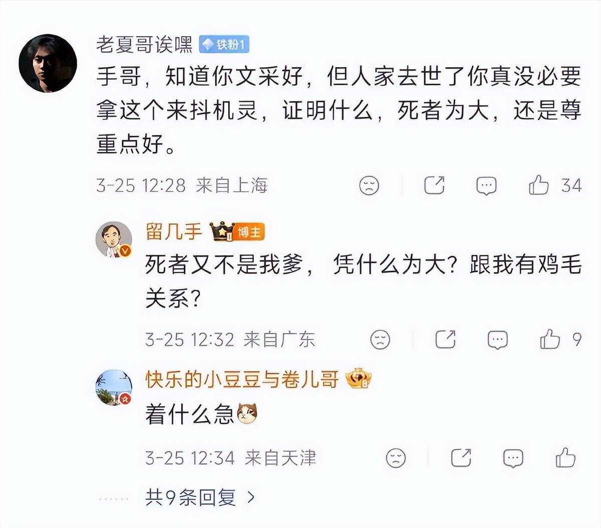 不知道这个留几手和张雪峰有什么深仇大恨,但逝者为大,总觉得不至于如此恶毒,太败坏路人缘了。 说实话,现在这个年代,越是奇葩的言论越容易涨粉博关注。 或许是看到了“流量红利”,连初代网红都忍不住下场,想要薄几分关注? 可是,如果站在事实的对立面,说几句看似“真心实意”的观点,以为网友就可以信服,转而又多了粉丝? 留几手这个行为,真的是够低级的。 原本只是一场全网惋惜的悼念氛围,被他的几句轻佻话语彻底打破,无数网友怒火中烧,纷纷喊话要求对其进行封杀。 这场舆论风波持续发酵,热度居高不下,过往积攒多年的争议也一并被翻出,彻底坐实了他无底线博流量的事实。 事情的起因,源于公众人物张雪峰离世的消息,这位深耕考研领域多年的从业者,凭借接地气的讲解、贴合学子需求的建议,收获了大批学生和家长的认可。 哪怕他不认可张雪峰,大可以不理会,偏偏发表高调言论,好像自己多么“别具一格”一般。 不说好的坏的,“死者为大”是最基本的道理吧? 谁能想到, 为博眼球的留几手,竟然轻飘飘打出了几个让人愤怒的“观点”。 原本沉浸在惋惜情绪里的网友,看到这般拿逝者抖机灵、蹭热度的言论,心里的怒火瞬间被点燃。 让人没想到的是,留几手非但没有意识到自己的问题,没有删除不当言论平息争议,反而依旧态度强硬,继续出言回怼,甚至放出“死者又不是我爹,凭什么为大”这类粗鲁话语。 言语间没有丝毫愧疚,更是彻底无视公众的规劝,把自己的冷漠和无底线展露无遗。 网友们纷纷表示,身为坐拥不少粉丝的网络红人,本该起到正向的引导作用,守住言论的底线,尊重生命、尊重他人是最基本的做人准则。 或许在他看来,深耕互联网多年,他的“标签”早已根深蒂固,此刻若不说个三二一,好像就对不上自己的头衔? 毕竟,他向来习惯用尖锐、刻薄的语言博关注,尤其爱对他人的外貌、身材进行恶意嘲讽。 此次触碰逝者为大的底线,不过是他长期以来无底线博流量的一次集中爆发,也让网友们彻底看清了他流量至上、毫无道德底线的本质。 网络不是法外之地,更不是可以肆意妄为、口无遮拦的法外之地。 身为公众人物,更要为自己的言行负责,不能因为坐拥粉丝、有一定的影响力,就无视道德准则、践踏公序良俗。 此次留几手的言行,之所以能引发如此大规模的众怒,归根结底是触碰了公众心中最基本的道德红线。 他多年来劣迹斑斑,争议不断,从未真正改过自新,才让网友们彻底失去耐心。 唯有守住底线、言行得体,才能获得大众的认可,若是一味地追求热度、无视道德,无视规则,最终只会自食恶果,被网友彻底抛弃,被平台清理出局。 对于这件事,您有什么想说的吗?欢迎评论区留言讨论。 信息来源: 羊城晚报•羊城派 2026-3-25 留几手发文暗讽张雪峰去世,惹众怒!网友建议:封杀