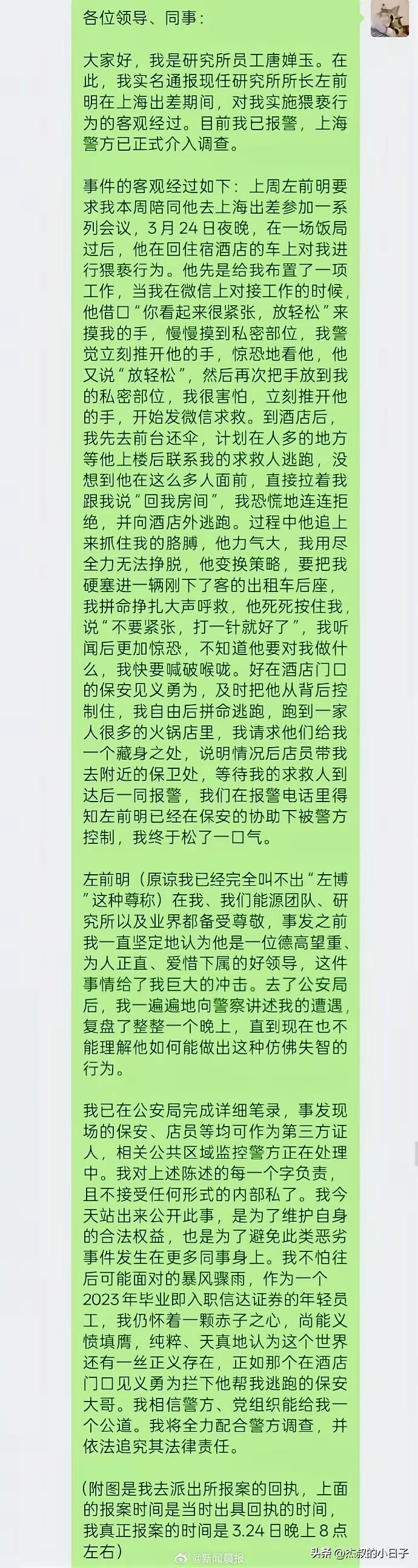 信达证券研究所所长左某,已经被抓! 一句“不要紧张,打一针就好了”爆火网络! 他猥亵女同事,女下属,已经被上海浦东警方依法刑事拘留,而且相关案件也在审理中。 这个披着“下矿百次”的左博士,人前是一位拥有匠人精神的专注深度价值研究的信达证券的所长。 位高权重。行业大佬。 在唐女士这样的行业小白眼里,这位左博士,那就是偶像啊,受人尊敬的前辈。 谁承想,人面兽心这是!借着出差在外,就对下属女员工,猥亵,明目张胆。 而且竟然还说“不要紧张,打一针就好了”打针?打什么针? 看这熟练的样子,听这头头是道的说话了,就知道,我们这位左博士绝对不是第一次干这事。 而且大概率,之前的事情,他都得手了。 相信警方会给我们一个解释,而这些在外工作的女生们,一定要注意保护好自己。