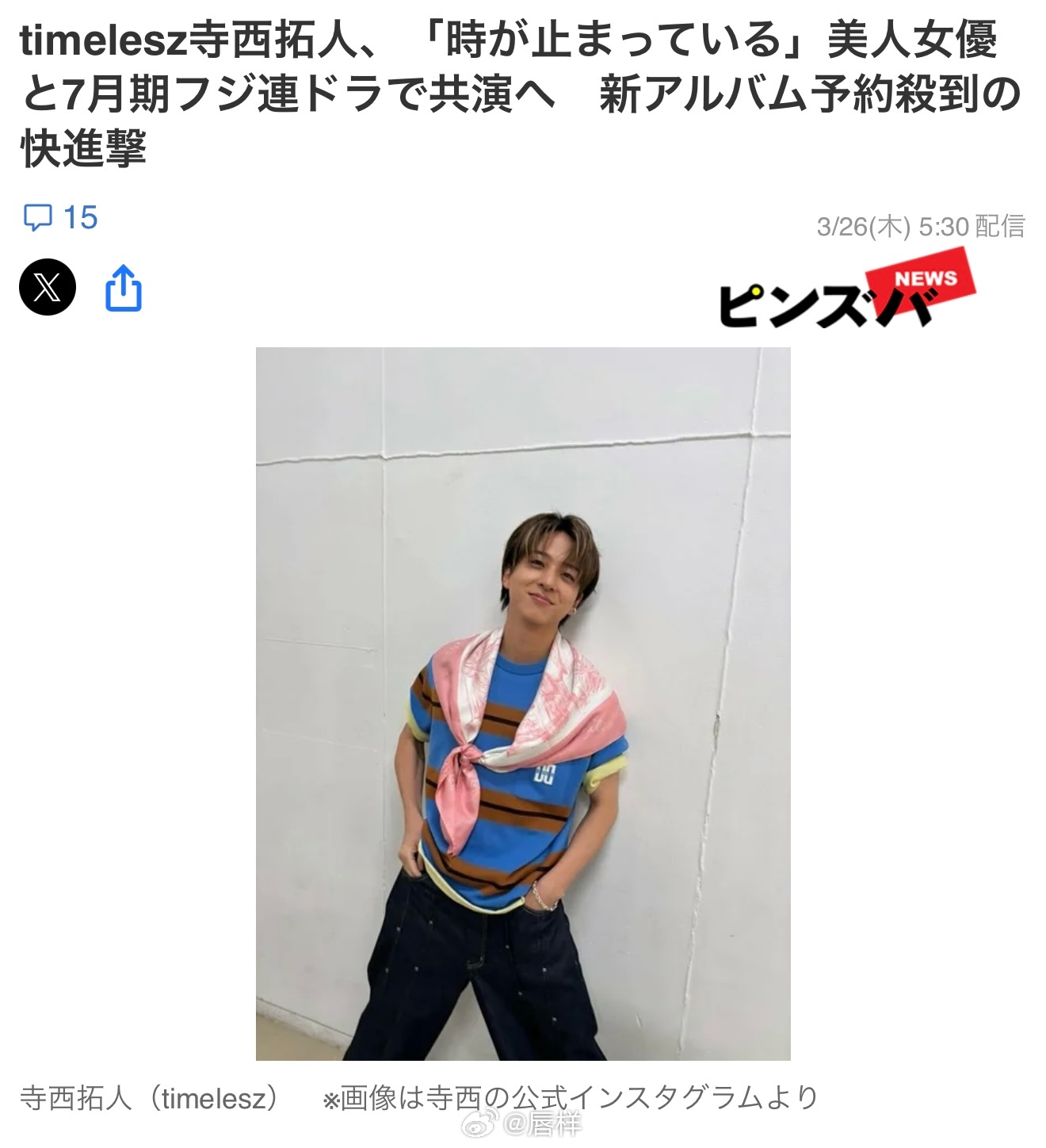 据称,timelesz的寺西拓人(31岁)将在今年7月播出的富士电视台「木10剧场」时段(晚10点)中首次担任黄金档连续剧常规角色。寺西将以二番的身份出演的这部7月期周四剧场,主演是女演员内田有纪(50岁)。寺西作为timelesz成员,有着“国民前男友”“音乐剧王子”之称,凭借出众外形拥有极高人气;而内田有纪也是被誉为“时间仿佛静止”、拥有公认不老神颜的人气女演员。两人年龄相差近20岁,这部周四晚间剧集预计会相当华丽耀眼。顺带一提,内田上一次担任连续剧主演,还是2016年1月播出的NHK BS Premium的『牙刷与女友』,距今已有10年之久。本网站就“寺西拓人是否将出演内田有纪主演的7月周四剧场”一事向富士电视台进行了问询,对方回应称:“关于节目编排的详细内容,恕不答复。”