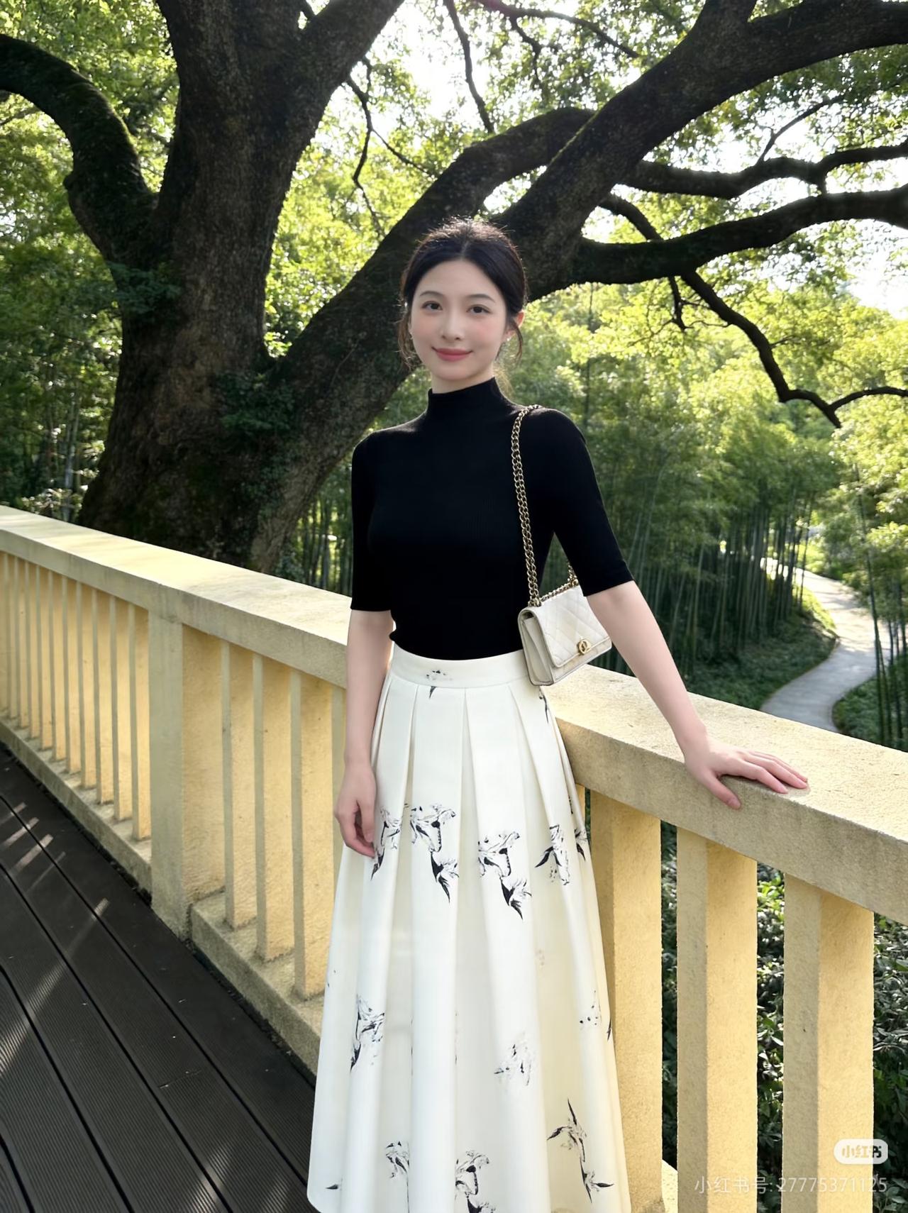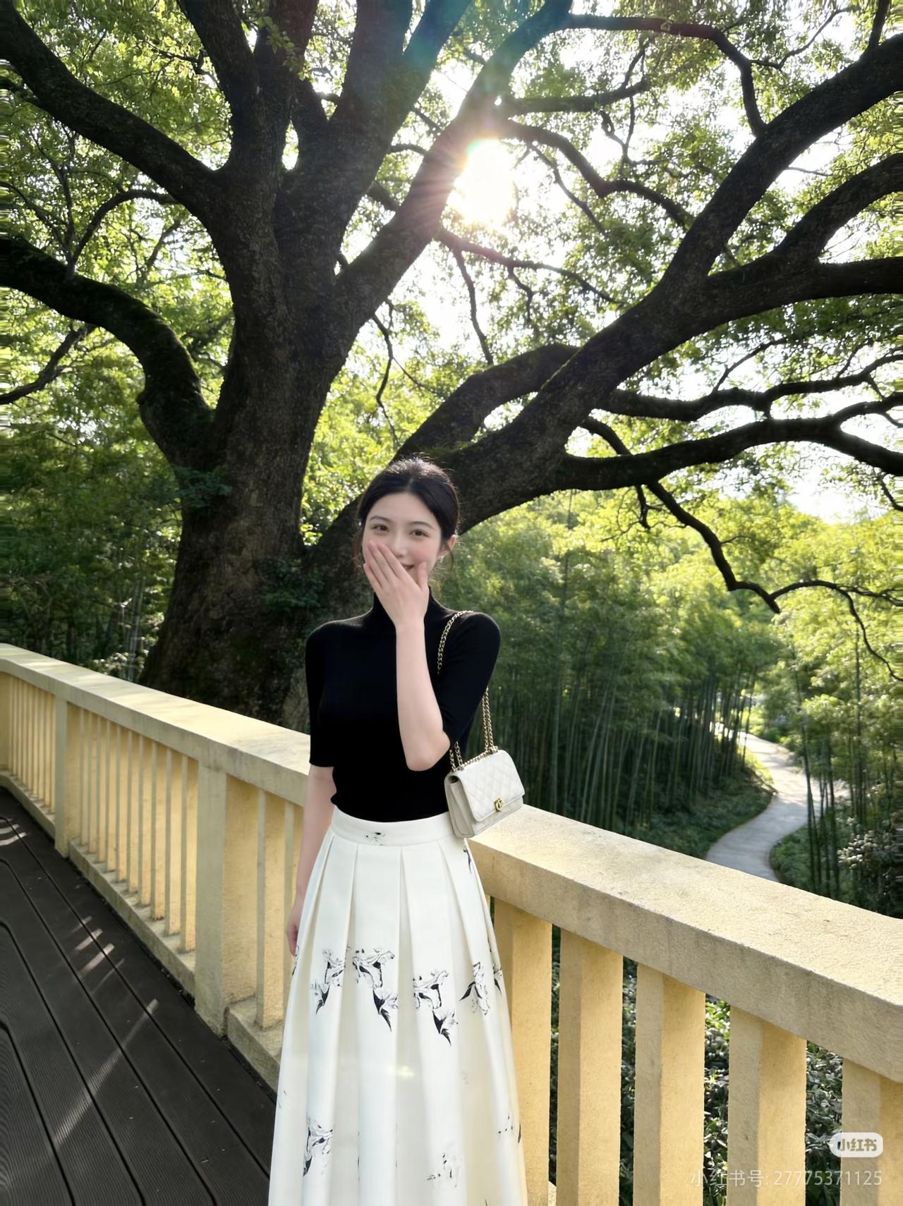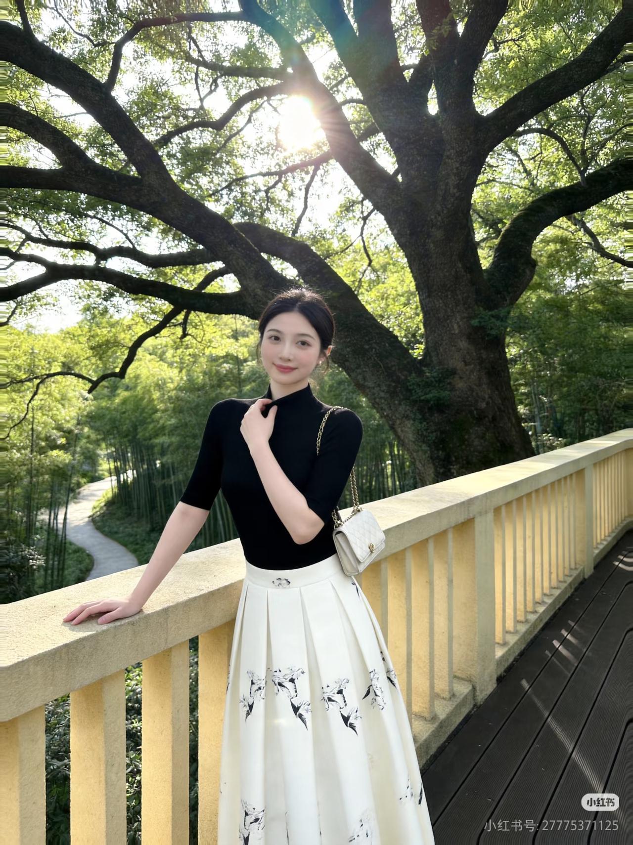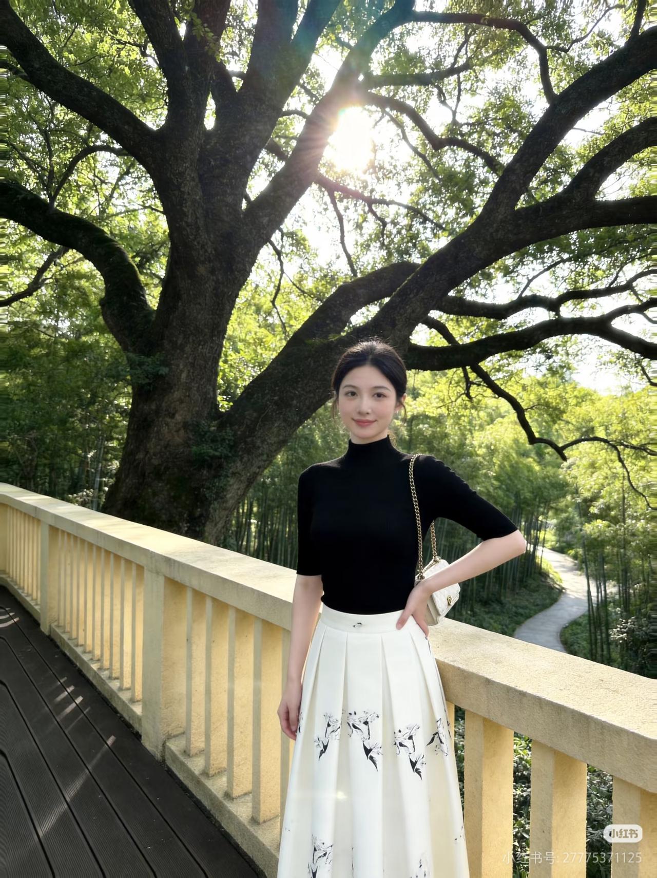 优雅黑衣配白裙,竹林间漫步,清新自然美。