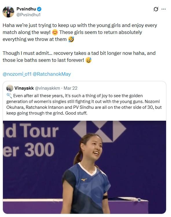 奥原希望法国奥尔良大师赛夺冠后,辛德胡、因达农的煽情互动 辛德胡:哈哈,我们只是努力跟上年轻姑娘们的步伐,享受每一场比赛!🥰 这些姑娘好像能把我们打过去的每一球都接回来 ⚡不过我得承认…… 现在恢复要花稍微久一点啦哈哈,那些冰浴感觉永远都泡不完!😅 因达农:姐妹,我们还在为梦想坚持,依然热爱打球。只是岁月在身体上留下了一点痕迹,需要更多时间好好恢复。祝贺你,奥原希望。