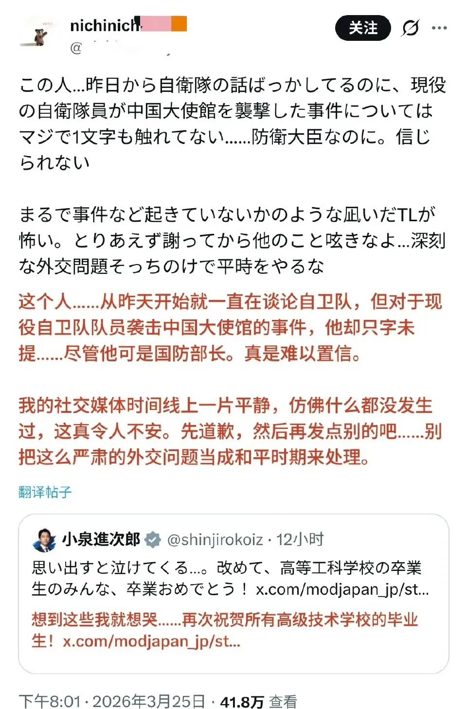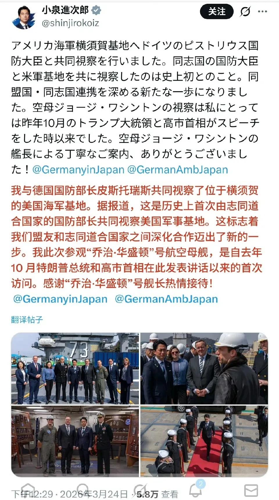 针对24日强闯我国驻日本大使馆一事,日本防卫大臣小泉进次郎只字未提,还在吹嘘日本自卫队、吹嘘和德国组成同盟如何如何。仅有内阁官房长官木原稔在记者会上表示“遗憾”,可以看出这个国家是多么的傲慢。 很多日本人其实都看不下去了,大家看看历史区上那群经常鼓噪“中日关系”的家伙们,也是非常默契的选择了沉默,这会也不说什么是“xx教育”、“xx环境”了。