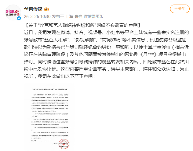 丝芭称与鞠婧祎从未和解 26日,发声明,称近日有账号散布“丝芭大和解”等不实信息,试图使各级监管部门误以为鞠婧祎与丝芭和解,以便于严重侵权及其他问题而被暂停播出的《月***》项目获得播出许可。丝芭称与鞠婧祎合约纠纷正在审理,双方从未达成任何和解。