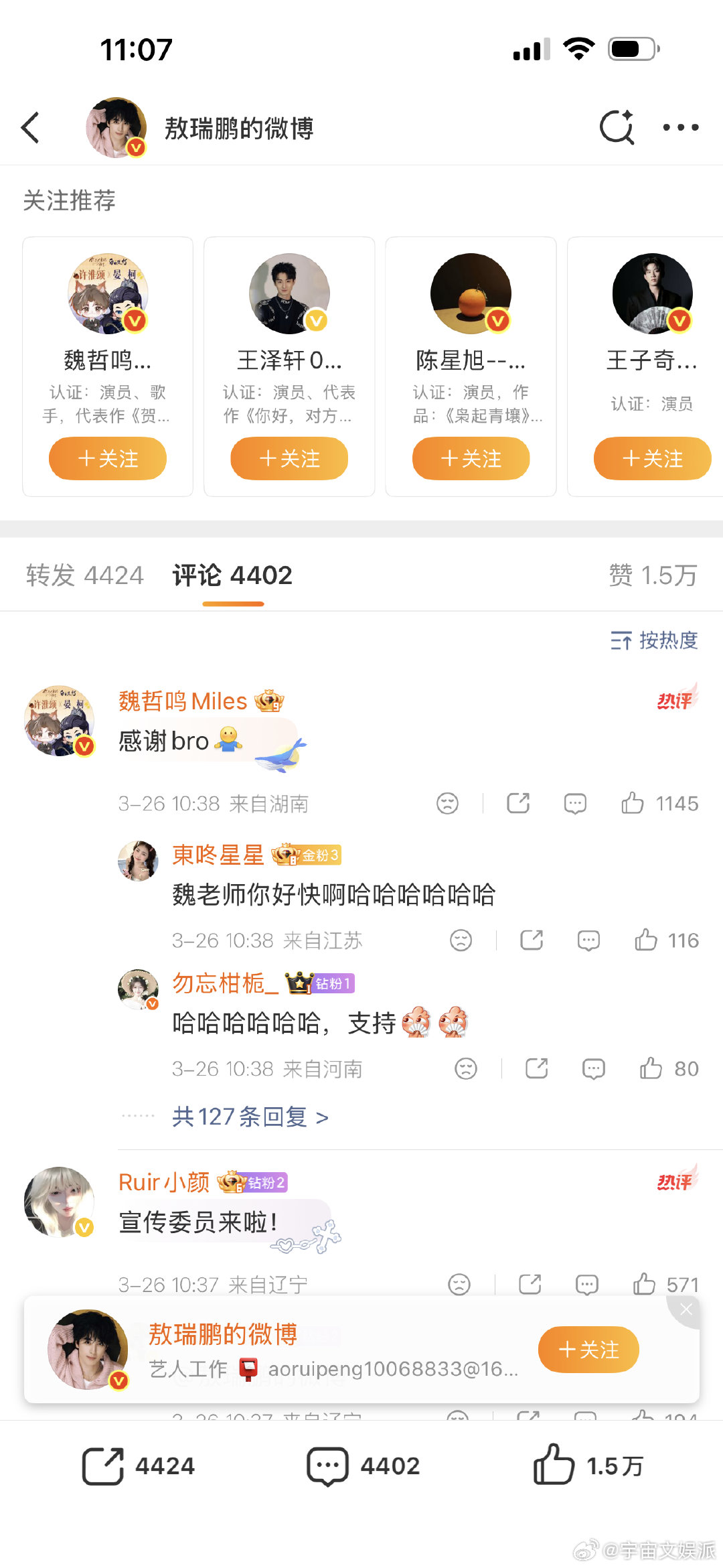 魏哲鸣回复白鹿魏哲鸣回复敖瑞鹏 新剧开播获白鹿、敖瑞鹏等好友力挺,魏哲鸣幽默回应,既展现了好人缘,也为剧集预热,不少网友表示要准时追剧。