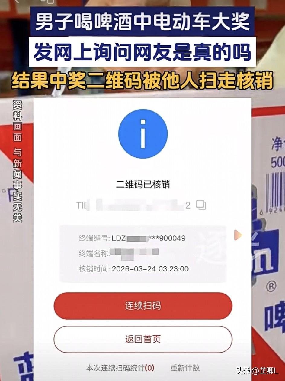 太离谱!广东男子买啤酒抽中电动车大奖,发网上晒奖竟被陌生人偷兑!网友:白高兴一场! 万万没想到啊,运气好到爆棚也能踩大坑?! 广东肇庆的一位大哥,最近买啤酒喝着喝着,居然抽中了一辆电动车大奖!换谁不得乐疯啊? 大哥当时还挺谨慎,拿着印着中奖信息的拉环拍了个视频,发上网想问问网友“这是真的吗?”,确认下大奖是不是靠谱。 结果万万没想到啊!他这随手一拍,直接给别人做了“嫁衣”——中奖二维码被视频里的陌生人抢先一步扫码核销了! 大哥当场傻眼,满心欢喜的大奖,瞬间就这么飞了?! 事情一出,网友们都笑疯了,同时也疯狂支招: 有人说这妥妥是“乐极生悲”,早知道就低调点,哪有把中奖码随便发网上的; 还有人支招,让大哥找品牌方查系统,谁核销的一查一个准,实在不行直接报警,不能吃这哑巴亏! 不少网友看完都直呼“上了一课”:原来抽中大奖还得藏着掖着,晒之前可得把关键信息捂紧了,不然好运分分钟变“祸运”! 也有网友替大哥鸣不平,说品牌方也得把把关,二维码这么容易就被核销,确实有点不严谨在的。 不过说到底,大哥这波也是太实在,以为只是问问情况,没成想网上啥人都有。 这也给咱们所有人提了个醒:天上掉馅饼的时候,先偷偷把好事办了,可别随便晒出来给别人“捡漏”啊! 不过呢,祸兮福所倚,福兮祸所伏,谁知道捡到这个大奖究竟是福是祸呢,只能说,时也,命也! 这事如果换作是屏幕前的你,你会怎么做?要不要追回这辆电动车? 素材来源:逐光新闻,侵联删!