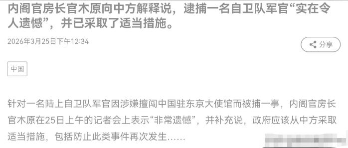日本终于打破沉默,出来回应了!3月25日,根据日媒报道,日本内阁官房长官木原在25日上午记者会上表示,对于自卫队军官持刀闯入中国大使馆一事,我方“非常遗憾”,政府应从中吸取教训,包括防止此类事件再次发生。我方已经向中方解释称,相关事件“实在令人遗憾”。 日本内阁官房长官终于打破沉默表态,表面是正式回应、表达歉意,实则是轻描淡写的外交搪塞,想用一句遗憾掩盖深层问题。 要知道,自卫队军官持刀闯入中国大使馆,这是非常恶劣的事迹,可日本对自卫官闯馆事件只用表示“非常遗憾”,称会吸取教训防止再发来打发,活像闯祸后随口一句道歉,毫无诚意。 可这绝非深刻反省,而是迫于外交压力的被动表态。中方连日严正交涉,日本国内理性声音不断质问,国际舆论也持续关注,日方再不发声只会更加被动,这才匆忙出来说场面话。 说实话,一句遗憾根本无法弥补事件造成的恶劣影响。中国使馆受国际法保护,现役军人持刀闯入,是对外交尊严的严重践踏,日方只谈吸取教训,却不彻查思想根源、不追究管理责任,完全是避重就轻。 也就是说,日方回避了最核心的问题。事件根源是自卫队受右翼思想渗透、日常管理严重失控,可日方全程不提思想整改,只说防止再发,根本是治标不治本。 更要警惕,这种轻描淡写的处理,只会纵容极端思想蔓延。不深挖根源、不严惩相关责任人,类似危险事件随时可能重演,不仅伤害中日互信,更会加剧地区安全风险。 要清楚,历史总是相似。日本面对历史罪责和现实极端行为,向来习惯用遗憾、反省等词语敷衍,从不真正彻底整改,最终让危险不断积累。 而未来,照这个趋势下去,日方大概率只会加强表面安保,以个人极端行为草草结案,不会触及右翼渗透和自卫队管理的核心问题。中方会继续要求日方彻查严惩、拿出实质整改措施,若日方持续敷衍,中日关系将进一步紧绷,外交信任也会持续受损。 说到底,日本一句“非常遗憾”,本质是缺乏担当的外交敷衍。没有实质整改、没有彻底追责,再多的道歉也只是空话,根本挡不住军国主义思潮回潮的风险。 以上是小编个人看法,如果您也认同,麻烦点赞支持!有更好的见解也欢迎在评论区留言,方便大家一同探讨。