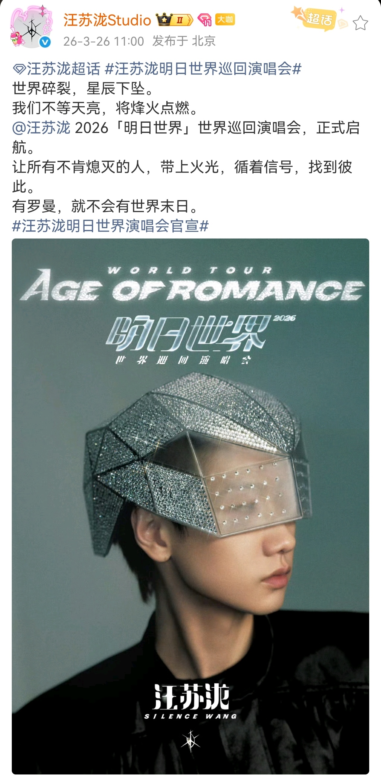 汪苏泷明日世界巡回演唱会 来了!汪苏泷明日世界世界巡回演唱会正式官宣!🎉哥哥一年三主题。。故事的篇章开始写新的冒险了!!!期待🙏🙏汪苏泷明日世界演唱会官宣