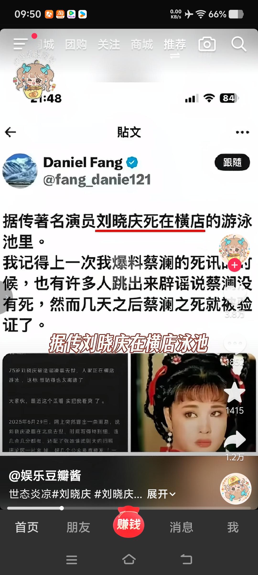 刘晓庆的外甥实在是太缺德了,居然在外网发文说刘晓庆去世了。 刘晓庆发了三条消息辟谣,不过很快又被她删除了,因为她查到发这消息的居然是自己的外甥。 刘晓庆对她这个外甥特别好,在他出生40天就抱养在身边,把他当亲儿子对待,还送他去澳洲留学。为了他读书方便,还在当地为他买了房子。 可惜他的外甥不是好的,就觉得刘晓庆的一切都应该是他的,恨不得她早点去世,把财产都留给他。刘晓庆这是养了一个白眼狼,真的是贪得无厌。