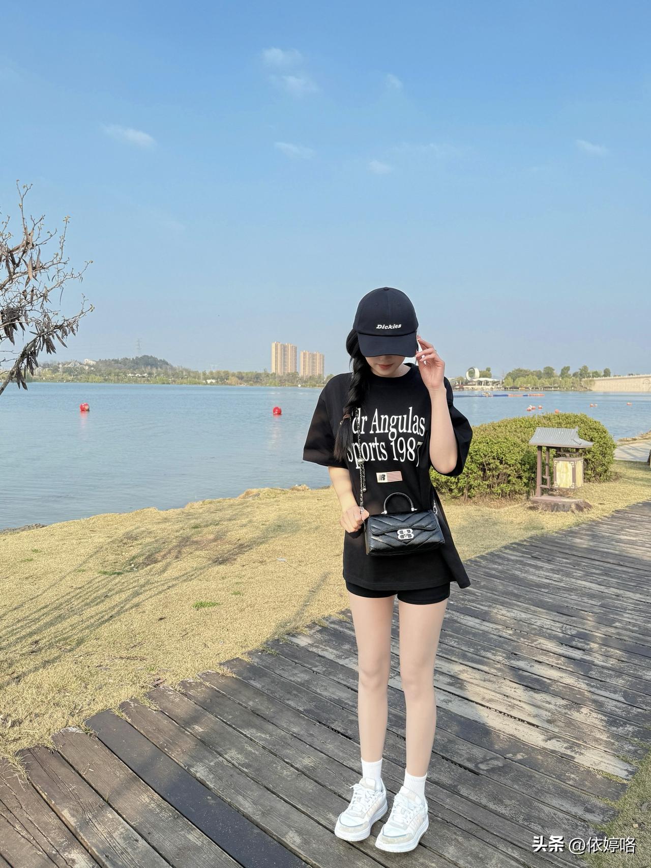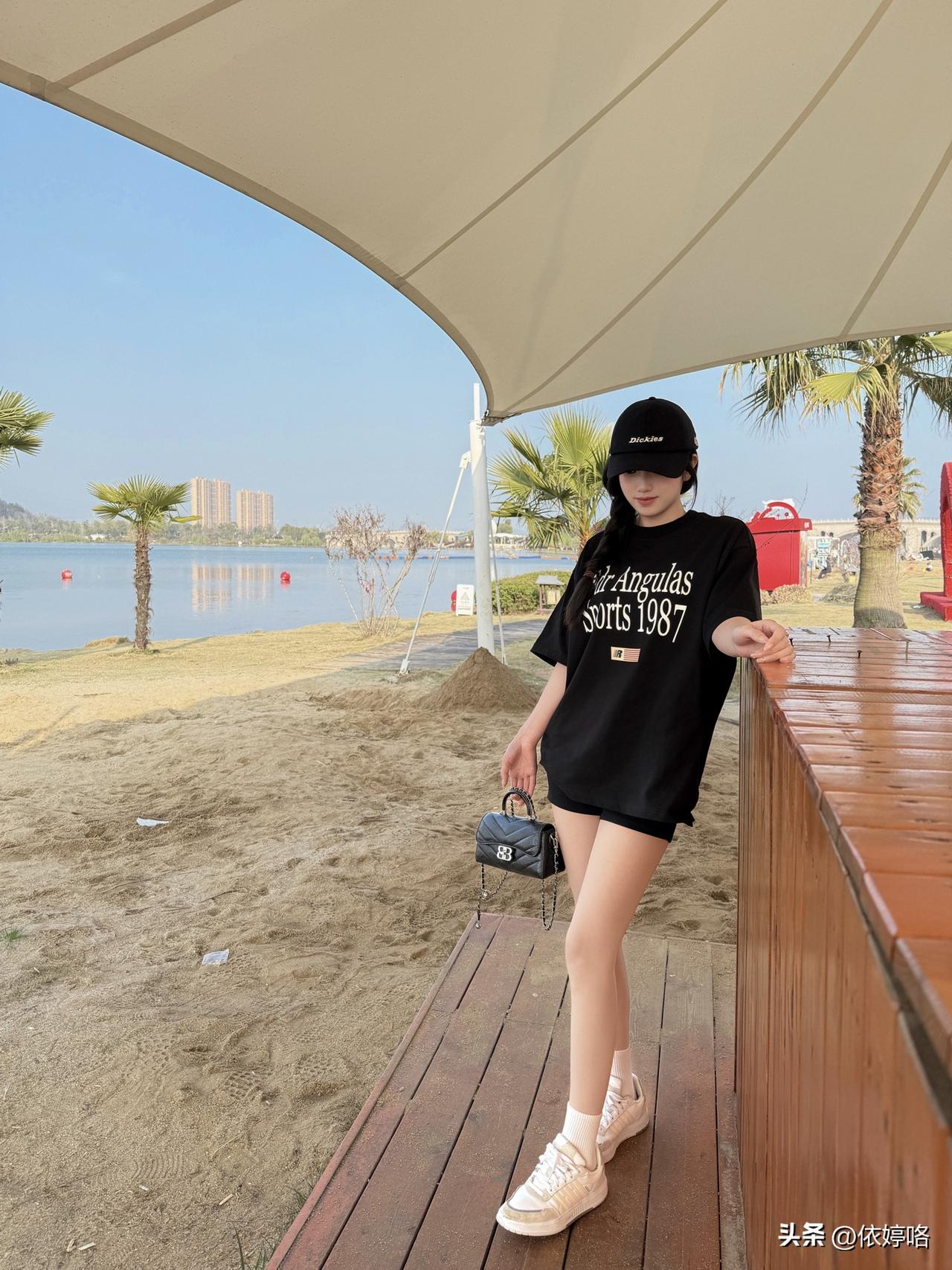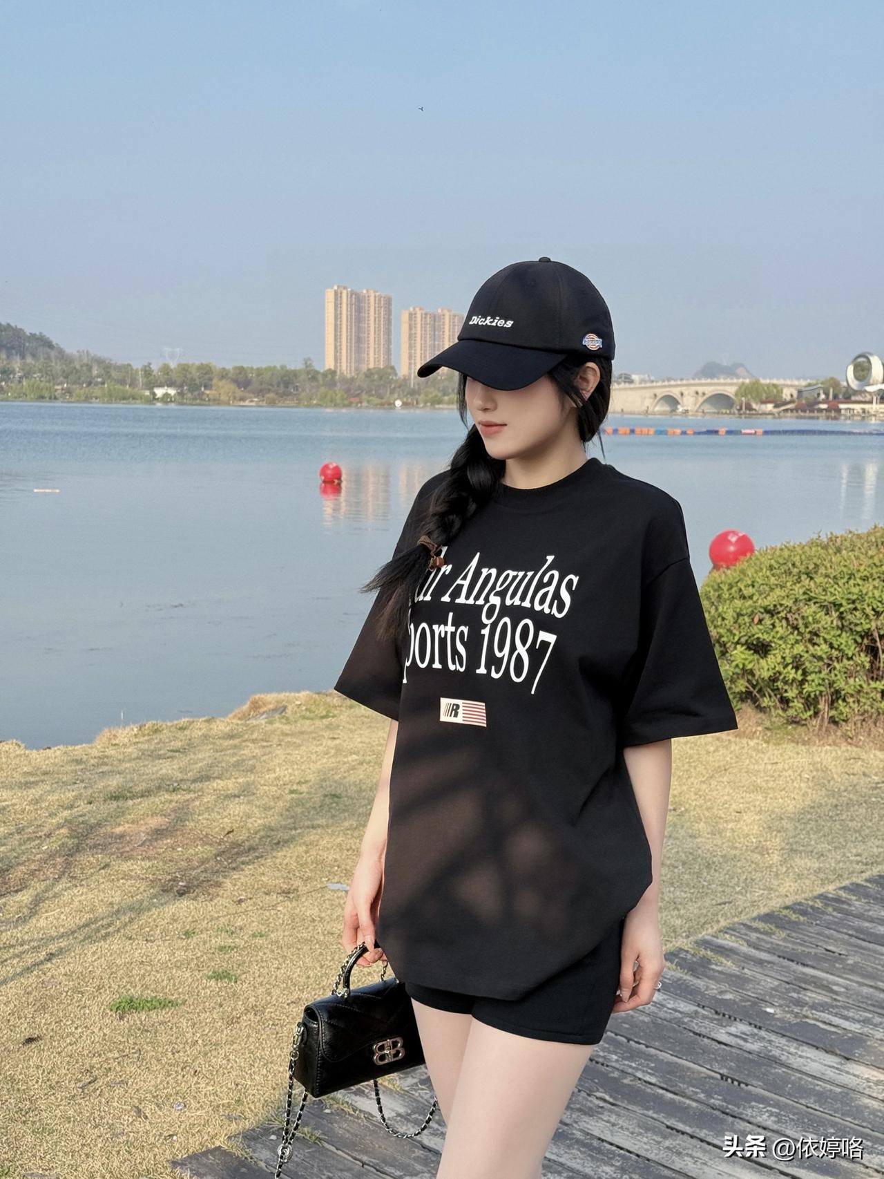 宝子们!在湖边随手拍都被追问链接的穿搭来啦~ 这件黑色字母T绝了!oversize版型藏肉又慵懒,胸前的白色印花复古又有设计感,软乎乎的面料穿起来超舒服✨ 搭配同色系短裤,下衣失踪穿法直接把腿长拉满!重点是这双裸色光腿神器(偷偷说巨自然!)+黑色棒球帽,休闲感拉满还显脸小,再拎个黑色链条小包,精致度一下就上来了~ 站在湖边木栈道上,蓝天碧水当背景,阳光洒下来的时候,感觉像在度假一样治愈,日常想穿出松弛感的姐妹闭眼冲这套!