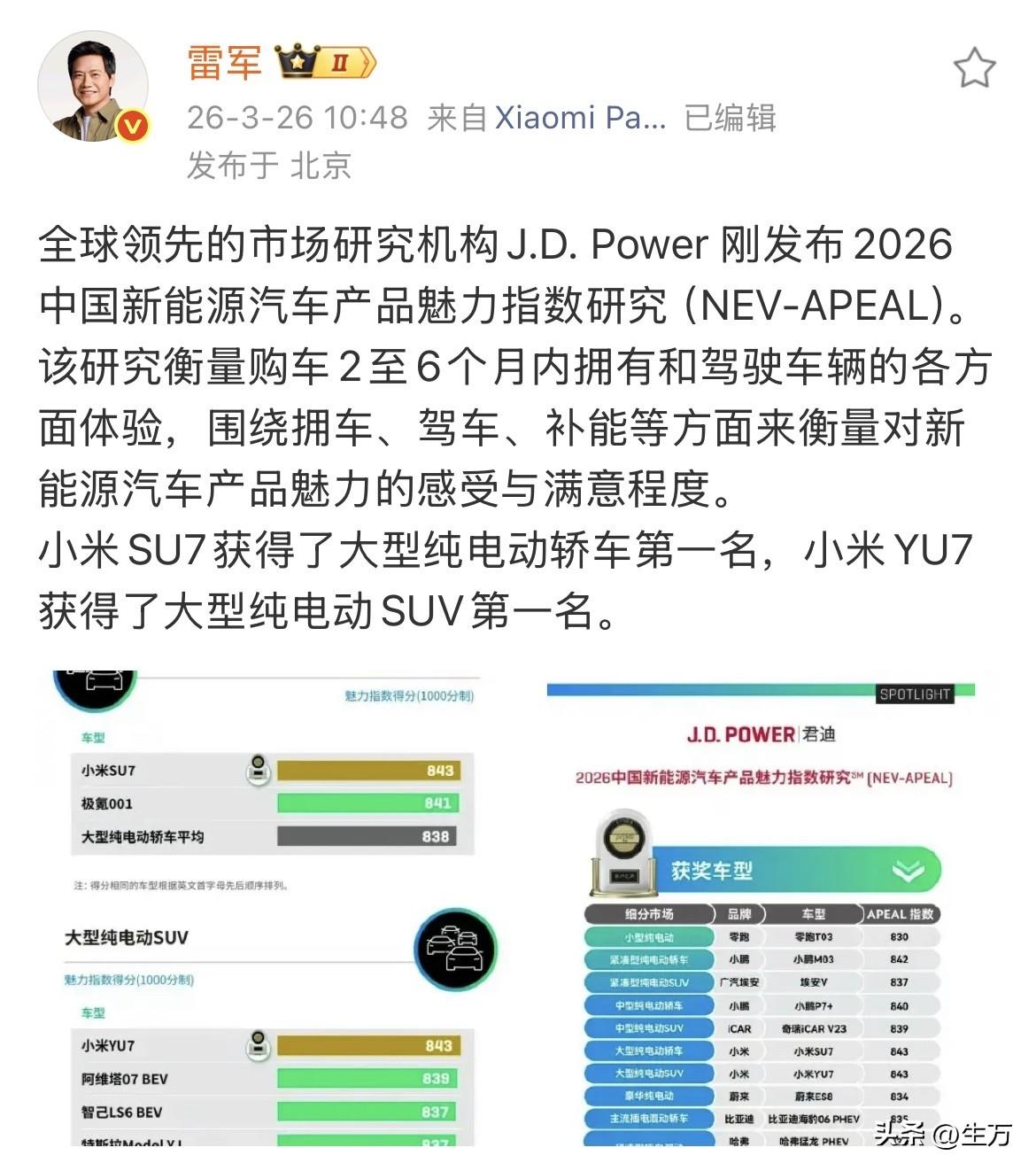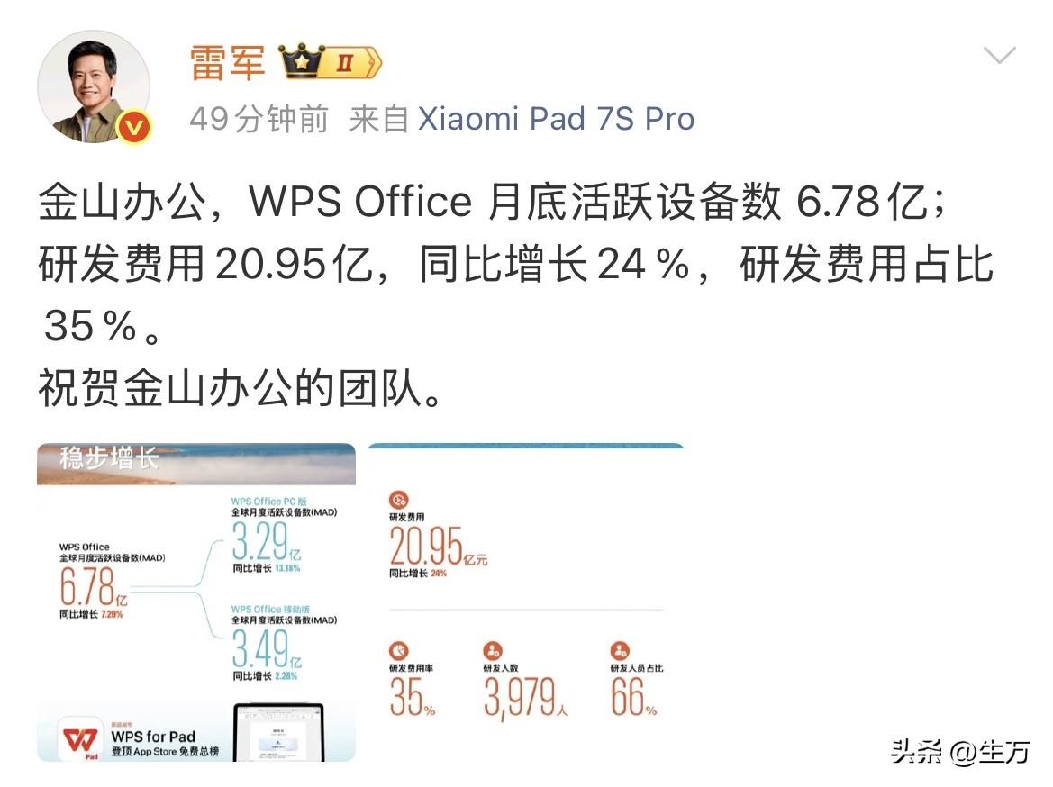 雷军祝贺金山办公团队! 就在刚才,雷军在社交网络晒出了金山办公,也就是WPS office的全球月活,没想到有这么多人使用,现在他们的月活能够达到6.78亿! 虽然昨天他卸任了这个办公软件的董事,毕竟这个软件跟着他几十年了,可以说是一手起来的,所以他还是发了几个软件相关的信息。 当然在发办公软件的同时,他也不会忘记发汽车的,不过这次是某一个机构发的,是汽车品牌的产品魅力指数,比较受欢迎的,分别是他们的小米SU7以及小米YU7。 他进一步给大家解释,为啥有这样的排名,很多人好像都没有什么听说过汽车魅力这种说法,是因为现在的汽车不单单是一个消费品,也是一种文化品牌,所以他们可能也要在这方面去做点补充。 因此这次评选,不仅仅从这个汽车的市场需求,受众的广泛,以及汽车本身驾驶器的舒适度和质量等等,还要从他线下的服务以及补偿等方方面面来综合评估。 也可以看成是今后汽车品牌,产品力和竞争力的综合表现。