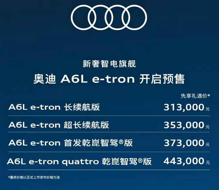 3月25日,一汽奥迪A6L e-tron开启预售,共推出4款车型,预售价31.3-44.3万元(详见下图)。新车基于全新PPE纯电平台打造,定位中大型车,采用800V电气架构,CLTC工况最大续航815km,10%-80%充电仅需20分钟,搭载华为乾崑辅助驾驶系统。外观保留家族基因,创新采用分体式车灯,矩阵前大灯与双激光雷达藏于前脸黑色装饰,日行灯提供8种图案;车身尺寸5073/1942/1522mm,轴距3076mm,配20英寸轮圈,侧面动感,采用电控门把手,可选电子后视镜;尾部引入第二代OLED尾灯,支持8种灯语变换,事故时可展示警示符号,奥迪LOGO夜间可发光,贯穿式尾灯具家族特征。内饰注重材质,车顶翻毛皮,中控三屏(11.9/14.5/10.9英寸),副驾屏可设隐私模式,提供第二代AR-HUD;座椅运动舒适,配Bang & Olufsen 20扬声器音响(带头枕扬声器)。动力提供单/双电机版,双电机总功率405千瓦,单电机最大功率215/265/260千瓦,CLTC续航720/815/745/721km,800V架构最大充电功率270千瓦,10分钟补能302km,10%-80%充电20.7分钟,最高车速200km/h,零百加速5.9/5.7/4.5秒,配备自适应空气悬架和FSD减振器。【来自懂车帝车友圈】
