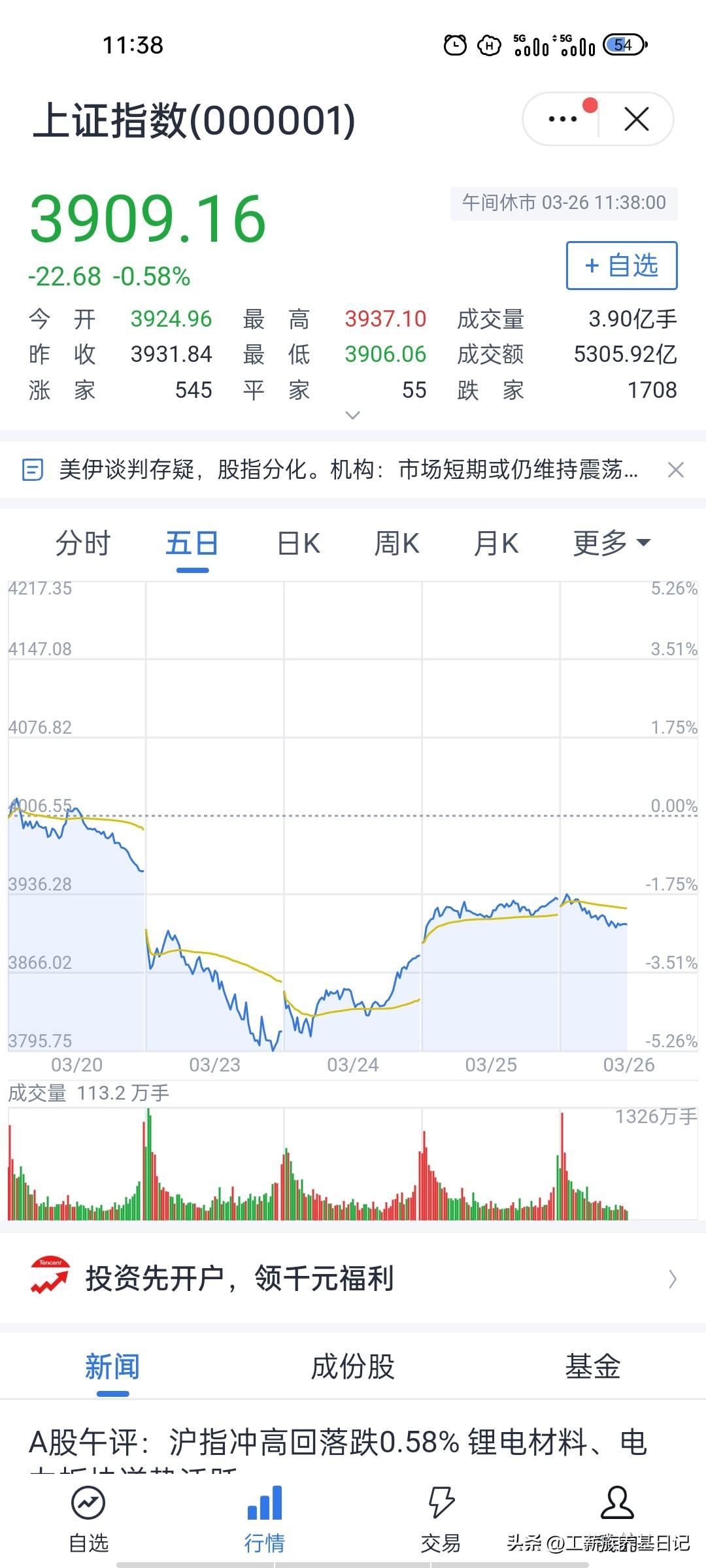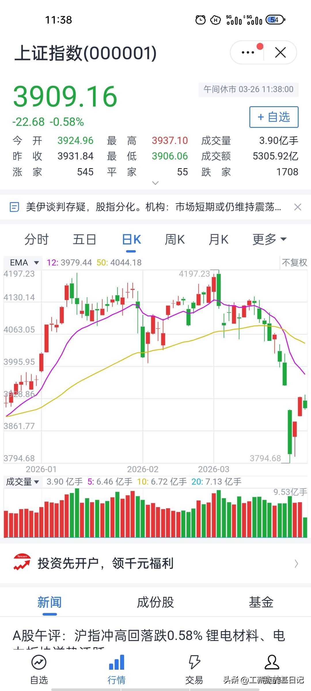 午盘如期回调,下午大概率继续磨底… 午盘沪指收3909.16点,下跌0.58%,完美兑现了此前震荡回调、小幅收绿的预判,目前指数在3900-3910区间磨底。量能3.90亿手,较昨日同期温和缩量,属于典型的存量资金博弈,既没有恐慌性抛压,也没有增量资金进场。涨跌家数约1:3,市场情绪偏谨慎,符合获利盘兑现叠加技术面承压的特征。 技术面上,3900点是关键心理支撑位,午盘已回踩3906附近,下方3890-3900为强支撑区域,上方3930-3950压力较重,下午大概率在3900-3930区间震荡。资金方面北向资金小幅流出,内资在板块间轮动,暂无明显做多或砸盘合力,量能持续萎缩下指数难有大波动。情绪上早盘获利盘已有所消化,下午整体会保持冷静,以震荡磨底为主。 下午走势大概率维持震荡格局,尾盘小幅收跌或收平,跌幅在0.3%-0.8%。若午后量能放大至4.5亿手以上且指数站稳3920,多头或有小幅反击;若跌破3900则可能回踩3890-3880,但此情况概率较低。 你们觉得呢?以上纯属个人意见,欢迎探讨。