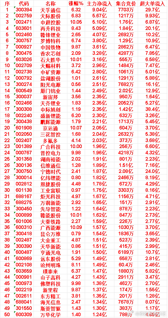 天孚通信:涨幅6.32%,主力净流入9.04亿天际股份:涨幅6.83%,主力净流入5.67亿中超控股:涨幅10.05%,主力净流入5.10亿再升科技:涨幅8.43%,主力净流入5.09亿赣锋锂业:涨幅2.65%,主力净流入4.07亿
