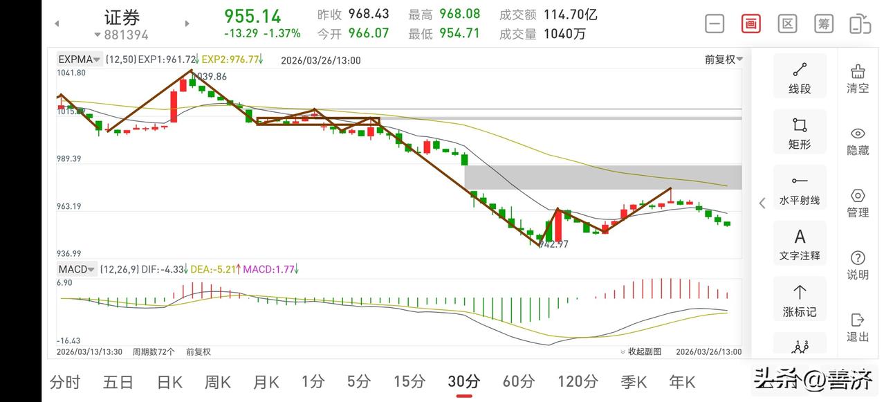 聊聊证券板块(2026.3.26) 今天证券板块的走势再次预判正确,早盘低开低走,毫无抵抗,尽管下探来势汹汹,但毕竟已处于调整尾端,只是还有点余波而已,此处不必恐慌,再熬一熬,更大的机会即将来临。 1.从30分钟图一上看,早盘的下探还是比较强劲的,而且这笔下探还没有出现5分钟中枢,所以这笔下探是没有结束的,待横盘整理后,还是有下探空间的。 2.从5分钟图二上看,昨天尾盘形成5分钟二卖后,在昨晚没有利好消息的情况下,今天的下跌其实是可以预期的,截止上午收盘,这笔5分钟的下探已经结束,下午在此处有望构建一个5分钟下跌中枢,待构建完成后,会形成一个盘整背驰走势,然后会围绕5分钟中枢做上下震荡,从而扩张成一个30分钟中枢的过程,所以目前是没有操作机会的,耐心等待空头释放殆尽后,再考虑操作的问题,到时我也会做出友情提醒。 总之,再熬一熬吧!黎明就在眼前了。