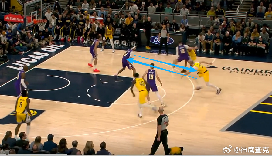 789 10 11转换进攻回合,无球快下奔至前场的内姆布哈德接西卡上球后立即启动右路突破直杀篮下,行进至罚球线附近遭遇“三人围剿”,人群当中控制住球后一记轻松写意的回身传球找到“Trailer”至弧顶的胡夫,助其三分命中。开局阶段通过两次与胡夫的连线帮助球队连得6分,将分差缩小至4分。
