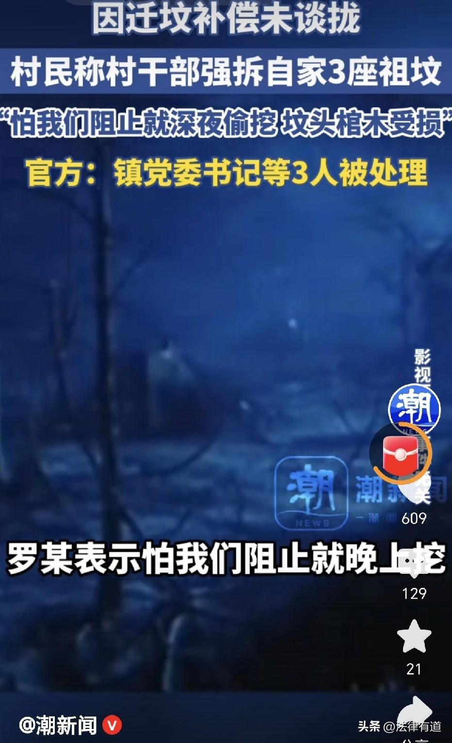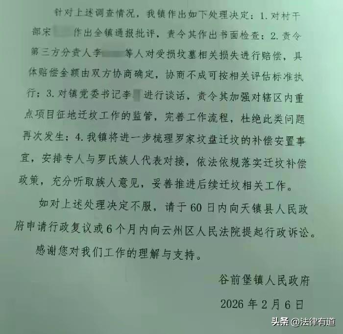 未谈拢就深夜挖坟!山西大同“祖坟被强拆”后续:镇党委书记等三人被处理。 近日,这起备受关注的“祖坟被强拆”事件有了官方处理结果。据新黄河等多家媒体报道,当地镇政府已确认此事,并对包括镇党委书记在内的三名相关责任人作出了处理。然而,这起事件所引发的关于“公权力”与“传统民俗”的碰撞,以及背后深刻的法律责任问题,依然值得我们深思。 事情还要追溯到一年前。据罗某介绍,2024年5月,因当地某酒庄项目建设需要,天镇县谷前堡镇政府发布了坟墓迁移公告,罗氏家族的19座祖坟被划入了征收迁移范围。 然而,在罗家人看来,所谓的“协商”并未真正达成。罗某表示,在补偿安置方案尚未与他们家族达成一致的情况下,一场“突袭”降临了。 2025年5月25日晚7点30分, 当地村干部宋某某指使第三方人员李某某等人,驾驶两台挖掘机,趁着夜色开始对罗家祖坟进行挖掘。罗家人发现后紧急赶到现场阻止,但此时已有三座祖坟遭到破坏,坟头受损,棺木被挖出甚至损坏。 “当晚在挖到第三座祖坟的时候被我家人发现后阻止,不然我们家族19座祖坟都要遭殃。”罗某在接受采访时这样说道。 事发后,罗家与当地政府陷入了长达数月的拉锯。直到今年2月6日,谷前堡镇政府才正式下发了《关于罗某反映事项的处理决定书》。 根据罗某提供的这份决定书,谷前堡镇政府对于此事给出了官方调查结论。 决定书承认,村干部宋某某虽然在前期开展过沟通工作,但 “在未与罗家后人就迁坟细节达成最终一致的情况下组织迁坟” ,导致祖坟受损,存在 “工作方法简单” 的问题。对于镇党委书记李某,决定书指出其对迁坟工作的后续推进环节 “监管有所缓慢” 。 决定对村干部宋某某:全镇通报批评,责令作出书面检查。对第三方施工责任人李某某:因操作不当造成实际损害,已被公安机关处以行政拘留15日;并被责令赔偿相关损失。对镇党委书记李某:进行谈话,责令其加强监管,完善工作流程。 尽管官方已作出处理,但罗某一家心中的疙瘩并未完全解开。时至今日,关于迁坟补偿的具体事宜以及受损坟墓的修复赔偿,仍需进一步协商。 @法律有道 祖坟不仅是“物”,更是精神寄托。这起事件之所以刺痛公众神经,是因为在中国传统观念中,祖坟承载着非同寻常的意义。那么,从法律上究竟该如何看待“挖人祖坟”这一行为? 1、祖坟兼具财产属性与人格象征意义。 在法律实务中,坟墓被视为一种 “特殊财产” 。江苏淮阴区法院曾在一份判决中明确指出,坟墓是“安葬已逝祖先遗骸或骨灰的特殊建筑物,也是后人追忆、祭祀的特定场所”,具有财产属性。 更重要的是,由于坟墓与死者亲属的精神寄托紧密相连,它也被界定为 “具有人格象征意义的特定纪念物品” 。因此,毁坏坟墓的行为,不仅侵害了财产权,更侵害了死者近亲属的精神利益。 2、行政拘留与民事赔偿双管齐下。 在这起大同事件中,我们可以看到清晰的追责路径: 一是行政责任:直接动手的挖掘机司机及指使者李某某等人,因违反《治安管理处罚法》关于故意损毁公私财物的规定,被处以15日行政拘留。 二是民事责任:根据《民法典》侵权责任编,侵权人需承担恢复原状、赔偿损失的责任。这包括修复坟墓的财产损失,以及给予死者近亲属的精神损害抚慰金。 三是过错认定:公职人员的“监管缓慢”也要担责。 值得注意的是,当地纪委对镇党委书记和村干部的处理,体现了公职人员在执行公务时的“程序正义”要求。虽然征地迁坟属于合法行政行为,但执行方式必须合法合规。“未达成一致即强拆” ,即便动机是为了“保障项目推进”,也属于违法行政。这种“工作方法简单”导致的损害,在民事赔偿中,也会作为认定侵权人过错程度的重要因素,影响赔偿数额的判定。 对于基层治理而言,这起事件是一个深刻的教训。重点项目建设固然重要,但“程序正义”不容忽视。迁坟关乎一个家族最朴素的情感底线,任何试图绕过协商、利用“夜间突袭”的方式“快刀斩乱麻”,最终斩断的不仅是逝者的安宁,更是政府与民众之间的信任纽带。 正如法律学者所言,坟茔不仅是土地的附着物,更是乡土中国“慎终追远”的文化符号。如何在现代化进程中,用法治的温情去守护这份古老的情怀,是我们必须面对的课题。