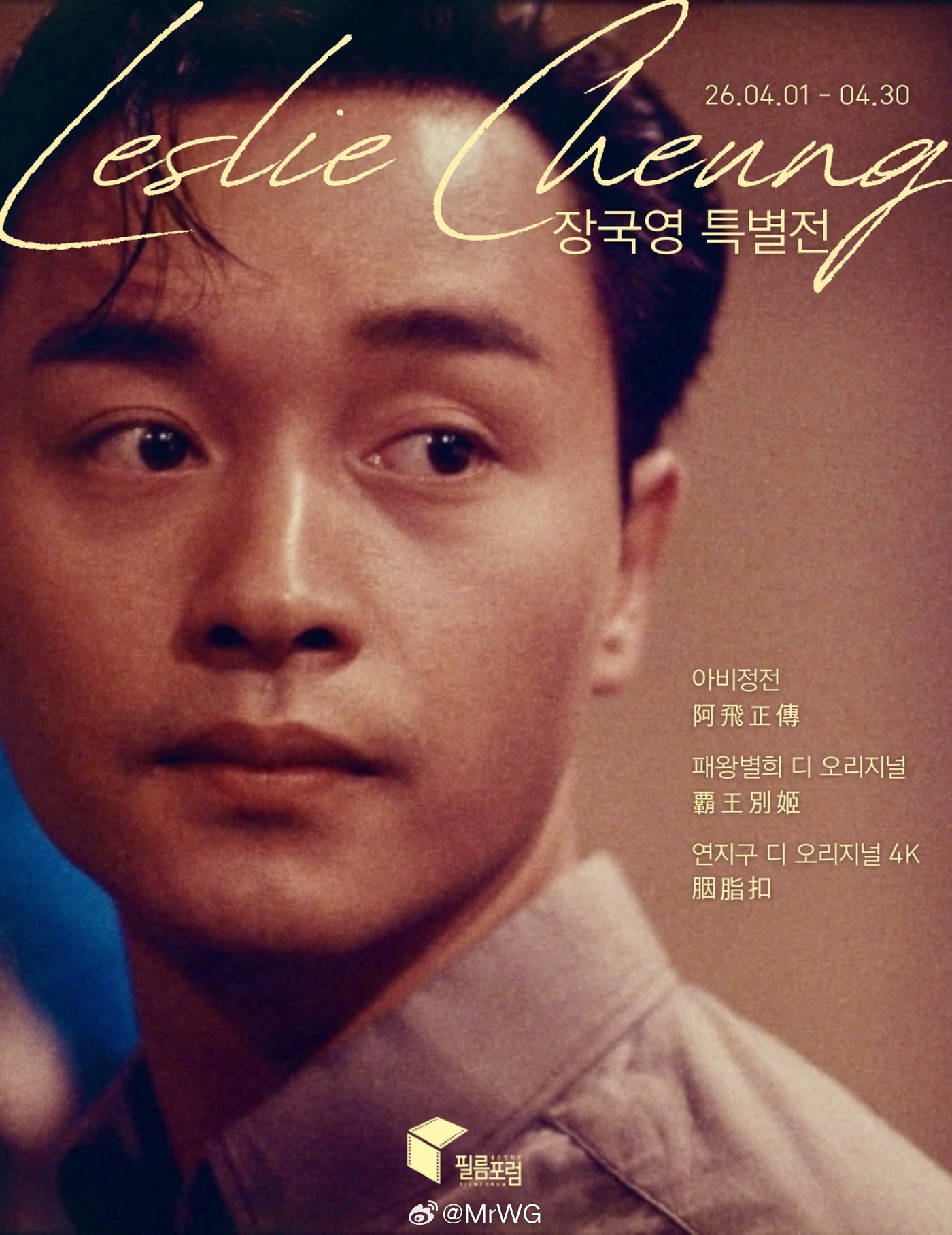 张国荣影讯 各种正版展映都多起来了——为纪念张国荣,韩国“Film Forum”推出“张国荣 特别展映 Leslie Cheung Special Screening”正版主题展映,从04.01–30举行。二十三周年继续宠爱张国荣