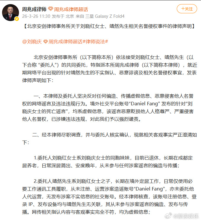 刘晓庆妹妹及外甥否认造谣刘晓庆妹妹及外甥回应 26日,刘晓庆妹妹及外甥委托律师发声明,否认发布刘晓庆去世相关消息,“从未参与任何涉案谣言的编造与传播”。此外,网络上传播的 “希望刘晓庆女士无后代”“窃取珠宝”“恶意诬告违建” 等内容,均系无事实依据的恶意捏造。