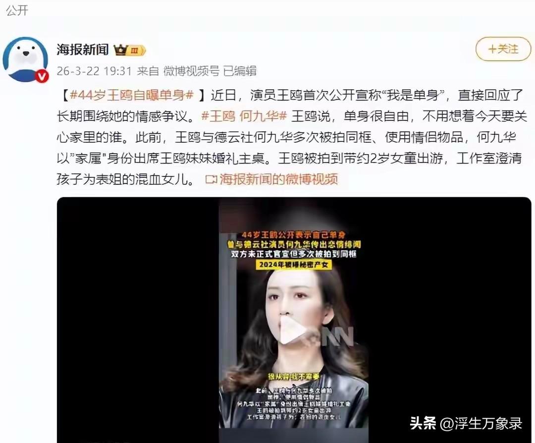 娱乐圈的瓜吃了一轮又一轮,王鸥的感情状态和生女传闻,更是被网友猜了好几年,各种版本传得有鼻子有眼,让人真假难辨! 没想到,一直低调沉默的王鸥,这次直接摊牌了,不再藏着掖着,亲口坦白自己当下的真实感情状况,彻底打破所有不实猜测! 在娱乐圈里,越低调的人,往往越容易被谣言盯上,王鸥这几年,真的太让人心疼了。一直以来,她都在安安静静拍戏,从不主动炒作私生活,可“秘密生女”“隐婚恋情”的谣言,却缠了她好几年怎么都甩不掉。 当年一张陪混血小女孩出行的照片,被全网无限放大解读,各种脑补剧情满天飞,一会儿说隐婚生子,一会儿胡乱绑定孩子生父,仿佛真有其事,越传越离谱,不少不明真相的网友都被带了节奏。 可很少有人知道,这个传闻早在去年就已经真相大白了,根本不是大家臆想的狗血剧情。那个孩子根本不是王鸥的女儿,只是她表姐的混血孩子,因为亲戚临时有事,才托付给她帮忙照看一段时间。 王鸥工作室也早已公开辟谣,把所有细节都摆得明明白白,只是吃瓜的人向来只爱听劲爆谣言,没人愿意静下心来关注真相,才让这个乌龙传闻反复被翻炒。 而这一次,一直选择沉默忍让的王鸥,终于不再回避,直面公开了自己的真实感情状态:目前单身,一心扎根事业,没有隐婚,没有未公开恋情! 一句话,直接终结了多年的无端揣测,所有绑定的绯闻、无厘头的造谣,全都不攻自破。 其实大家都看在眼里,王鸥从来都是靠演技说话的演员。从《伪装者》里惊艳全网的汪曼春,到后续一部部扎实的影视作品,她始终踏踏实实拍戏,从不靠绯闻博眼球。 就因为一次好心帮亲戚照看孩子,就被恶意造谣这么多年,换谁都会觉得委屈。40+的她,早已活得通透清醒,人生怎么过、感情怎么选,从来都不需要向外界交代。不被流言绑架,不被八卦消耗,专心做自己,才是最酷的活法。 也希望所有人都能明白:不信谣,不传谣,不恶意揣测,才是对一个好演员最基本的尊重。多关注她的作品,少议论她的私生活,比什么都重要。 王鸥 王鸥最新回应 王鸥感情现状 王鸥生女传闻真相