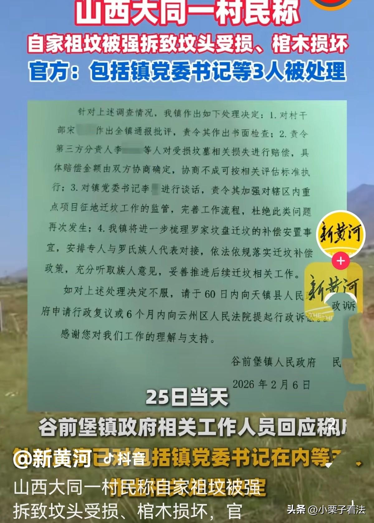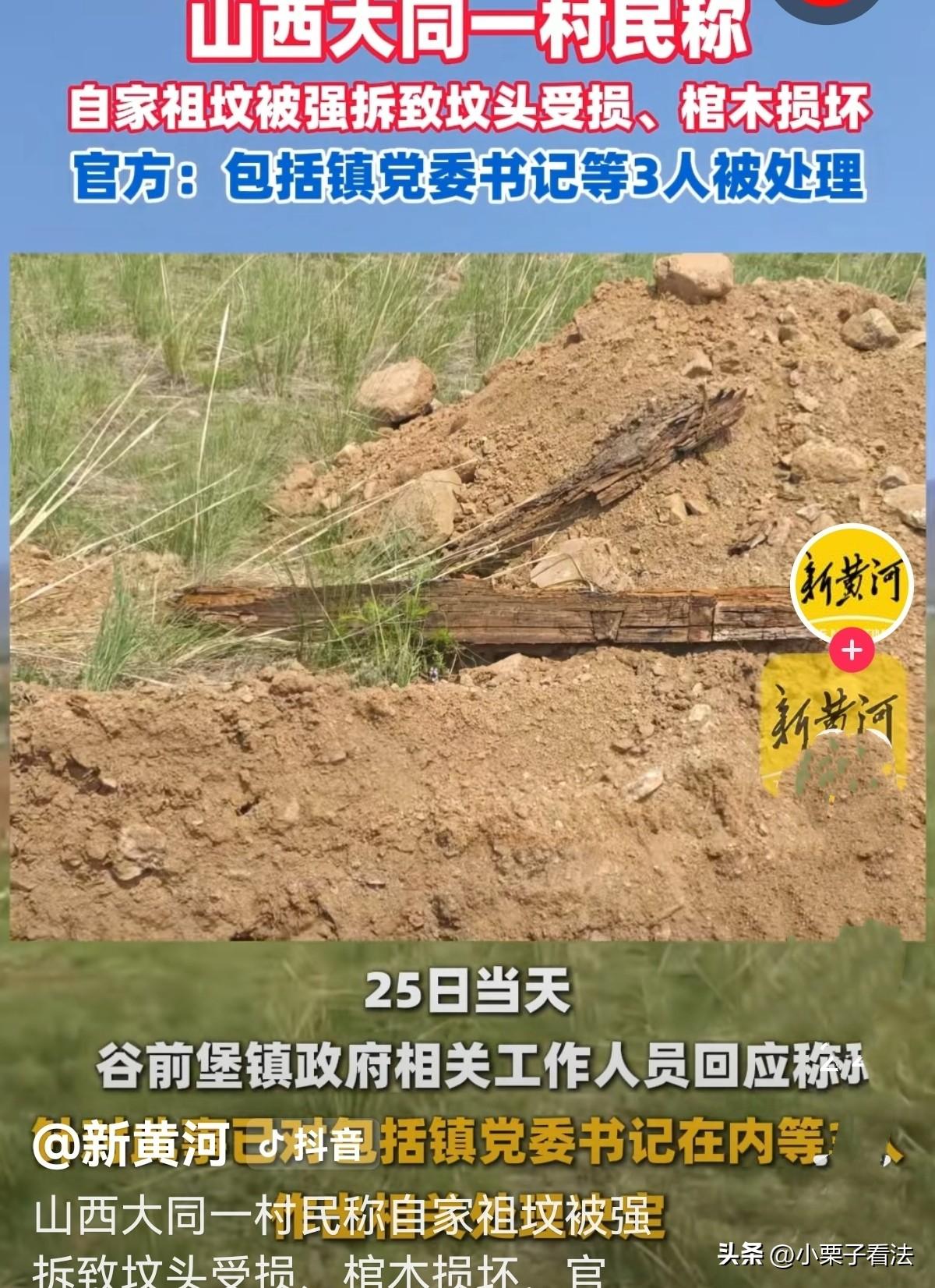 天理难容!山西大同,男子家的19座祖坟被公告在一酒庄建设项目范围内,要求迁坟,因族人分布各地,并未协商出具体补偿和迁移方案。谁知,相关单位竟在夜黑风高的夜晚偷偷去挖坟,等男子发现时,3座祖坟已被破坏,场面狼藉一片,他拼命阻止才叫停。男子经近一年的维权,他终于得到了处理结果!网友:挖坟掘墓是最缺德的事! 2026年3月25日,罗某对着记者说起自家祖坟被强拆的事,依旧气得浑身发抖,眼眶泛红。 对他和整个家族来说,2025年5月25日那个夜晚,是这辈子都忘不了的噩梦,而这件拖了快一年的事,终于在近期等来了官方的处理结果。 事情还要从2024年5月说起,当时镇政 府贴出了一份迁坟公告,说是县里要推进一个酒庄项目建设,受县政府委托,得把项目用地范围内的坟墓全都迁走,公告里也写了迁坟时间和补偿登记的相关事项。 罗家在这片地里有19座祖坟,都是祖辈一代代留下来的,对罗氏族人来说,这些祖坟是根,是念想,谁也不敢轻易动。 公告出来后,罗某和家人们一直等着有人来好好协商补偿和安置的事,可左等右等,始终没等到镇里、村里和他们敲定具体方案。 罗家亲戚多,分布在不同地方,关于补偿怎么分配、坟迁到哪里,族人内部确实没完全达成一致,这本该慢慢沟通解决。 可谁也没料到,对方根本没打算好好谈,竟然选择了最伤人的方式。 2025年5月25日晚上,天色漆黑一片,村里格外安静。 罗某和家人怎么也想不到,两台挖掘机已悄悄开到了自家祖坟地,村干部宋某某直接指使施工方的李某某等人,趁着夜色偷偷挖坟。 他们就是怕罗家人事先知道,赶来阻止,才选了晚上动手,想悄无声息把19座祖坟全都迁走。 那天晚上,罗某家人碰巧路过祖坟地,远远就看到挖掘机的灯光在晃动,还听到轰隆隆的挖掘声,心里顿时咯噔一下,赶紧跑过去查看。 眼前的一幕让他们瞬间崩溃,三座祖坟已被挖得面目全非,坟头全被铲平,棺木也被挖坏,残破的木板散落在土里,场面惨不忍睹。 家人又急又气,当场冲上去拼命阻止,施工人员才不得不停下手里的活。 罗某事后想想都后怕,要是再晚发现一步,整个家族19座祖坟,全都要遭此劫难,那真是对先人的大不敬。 祖坟被强挖,对罗某一家人来说,不仅是财产受损,更是情感上的巨大伤害。 从那天起,罗某和家人踏上了维权路,一次次找镇政府、找相关部门,要求严查此事,给他们一个公道,可事情一直拖着,迟迟没有妥善的处理结果。 他们心里又委屈又愤怒,明明没协商好,凭什么半夜偷偷挖祖坟,这换谁能接受? 直到2026年2月6日,镇政 府终于下发了处理决定书,把这件事的调查结果和处理方案说了出来。 这份决定书的真实性,也在3月25日得到了镇政 府工作人员的确认,并且已上报给了相关部门。 决定书里承认,村干部宋某某前期确实入户走访过,也去内蒙古、大同等地找过在外的罗氏族人沟通,还发了迁坟告知书,但确实没和罗家后人就迁坟细节达成最终一致。 《治安管理处罚法》第65条:(一)故意破坏、污损他人坟墓或者毁坏、丢弃他人尸骨、骨灰的。情节严重的,处10日以上15日以下拘留,可以并处1000元以下罚款。 宋某某为了赶项目进度,执意组织迁坟,让第三方施工,工作方法太简单粗暴。 而施工方的李某某等人,现场操作不当,才造成三座祖坟受损、棺木损坏,他们也为此付出了代价,被公安机关行政拘留15天。 对村干部宋某某全镇通报批评,责令他写书面检讨。 《民法典》第1165条第1款:行为人因过错侵害他人民事权益造成损害的,应当承担侵权责任。 要求李某某和施工方赔偿罗家的损失,具体金额双方协商。 根据 《刑法》第397条,对党 委书记李某,对迁坟工作后续监管不到位、进度缓慢,存在监管失职的问题进行谈话,责令他以后加强重点项目征地迁坟的监管,完善工作流程。 同时,镇里也承诺,会专门安排人和罗氏族人代表对接,按规定落实迁坟补偿,好好听族人的意见,把后续迁坟工作妥善办好。 折腾了快一年,罗某和家人终于等到了相关人员被处理的结果,心里的委屈总算有了些许慰藉。 有人说,自古以来挖别人祖坟,是羞辱他人祖宗,遇到不要命的会出大事的! 有人说,刨人祖坟天理难容,亡人也不让安息,严查,法律会迟到,但不会缺席! 还有人说,这种事都有人干,果然最怕的不是鬼是人,太缺德了! 对此您怎么看?