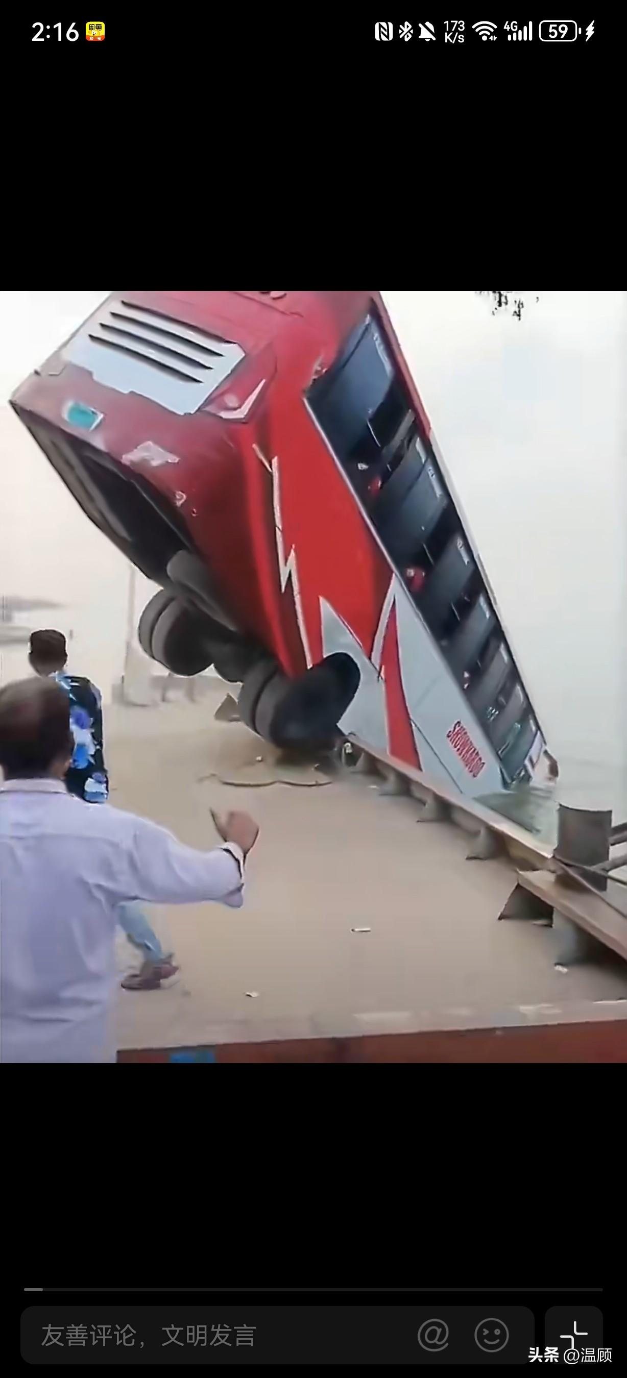众目睽睽之下,这一幕简直让人窒息! 当地时间2026年3月25日下午,孟加拉国帕德玛河一处渡轮码头,一辆载有40-50名乘客的大巴,在登上渡轮的瞬间突然失控,径直坠入9米深的河中。 事发就在众目睽睽之下,周围路人根本来不及施救,只能眼睁睁看着满载乘客的大巴沉入河里,现场满是绝望与慌乱。 截至目前,这起惨烈事故已造成23人死亡,还有部分人员失踪,当地消防、海军等部门已紧急展开救援,但受降雨和湍急河水影响,打捞搜救工作难度极大。 具体事故原因还在进一步调查中,一场普通的出行,却酿成无法挽回的悲剧,愿逝者安息,也盼失踪者能平安获救。