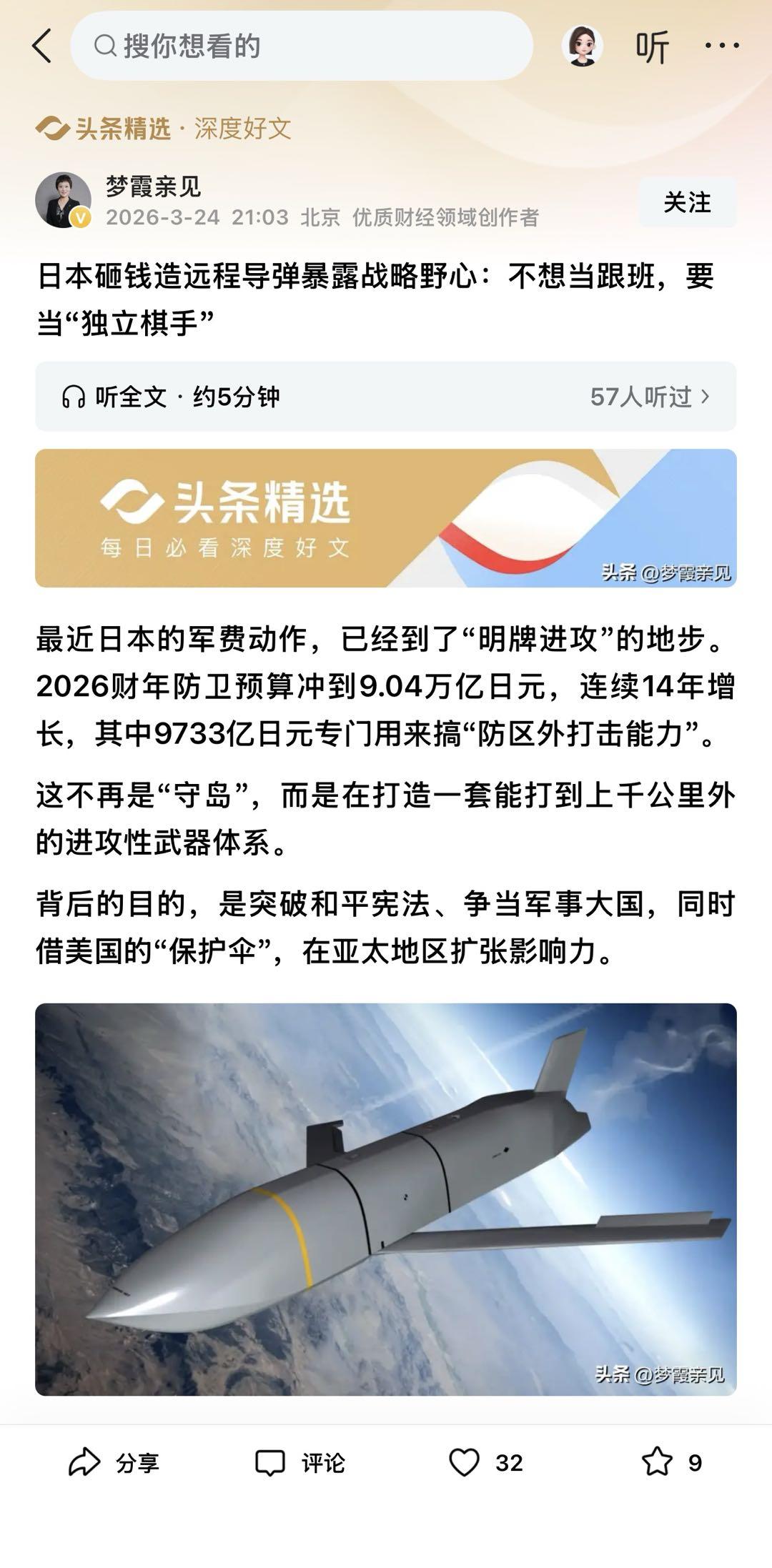 骇人听闻!日本军费14连增,9000亿日元打造千公里打击网,剑指西南要干嘛? 2026财年防卫预算冲上9.04万亿日元,连续14年增长,其中9733亿专门用来搞“防区外打击能力”。 翻译成人话:打造一套能打上千公里的进攻性武器,不再是“守岛”了。 核心是改进型12式反舰导弹,射程从200公里涨到1000公里以上,已部署在九州熊本县,下一步是冲绳。 这玩意儿不光能打军舰,还能打港口、指挥中心。 为了补缺口,日本还采购200枚“战斧”巡航导弹,射程1600公里;同时买JSM和JASSM空射导弹,装备F-35A和F-15J战机。 更狠的是在研的高速滑翔弹和高超音速导弹——基本型射程500-900公里,5马赫。 改进型直接飙到3000公里以上,超10马赫,基本拦不住。 把这些武器优先堆在西南诸岛。从熊本算,1000公里覆盖中国沿海;2000公里覆盖台北,南海也在射程内。 日本2025年成立“统合作战司令部”,统一指挥陆海空自卫队,还要管太空、网络。 武器出口政策也在加速松绑,从只卖非杀伤性装备,变成能出口护卫舰、先进防空系统。 这不是“自卫”了,这是在为军事大国铺路。