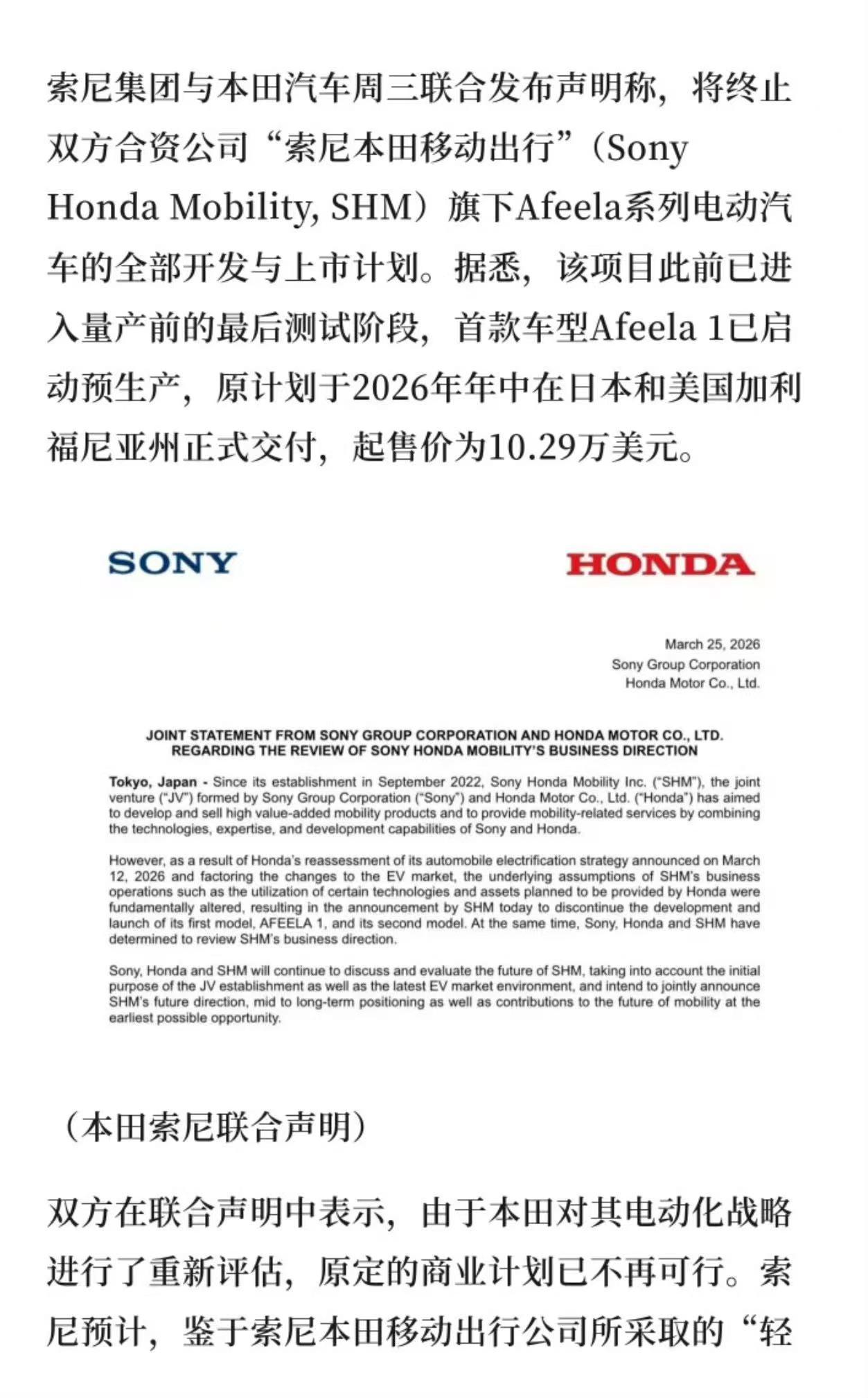 3月25日,索尼集团与本田汽车联合宣布,双方将终止旗下合资公司索尼本田移动出行的Afeela品牌电动汽车的开发与发布计划。声明指出,终止合作的核心原因在于本田汽车对其全球电动化战略进行了重新评估,认为原定的商业计划在当前行业环境下已不具备可行性。索尼方面表示,得益于此前采取的轻资产运营模式,此次合作变动预计不会对索尼集团的财务状况产生重大影响。(白鹿视频)
