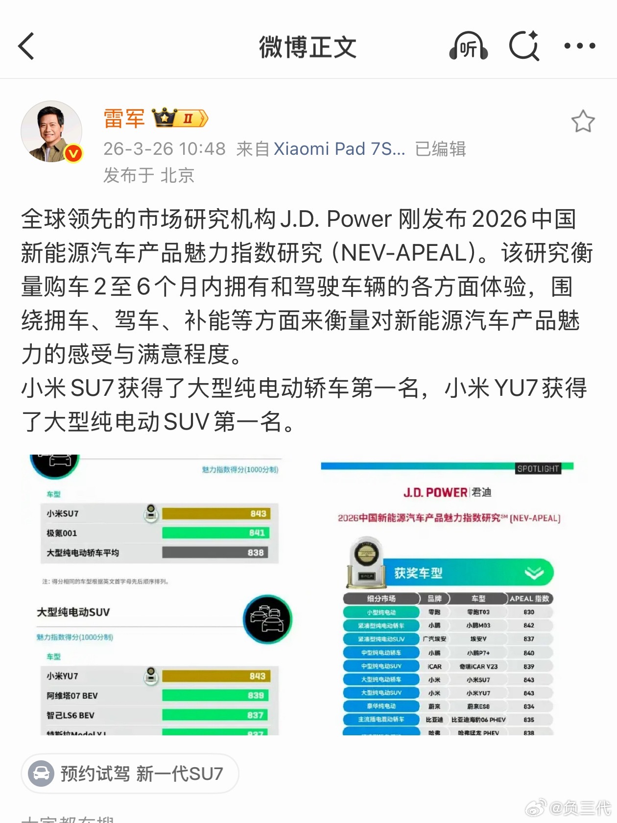 雷军谈小米双车获JDPower魅力榜第一别的都先不谈,车主真实购车后的主观喜爱度,是一款汽车产品力最好的说明雷军回应小米双车登顶JDPower魅力榜