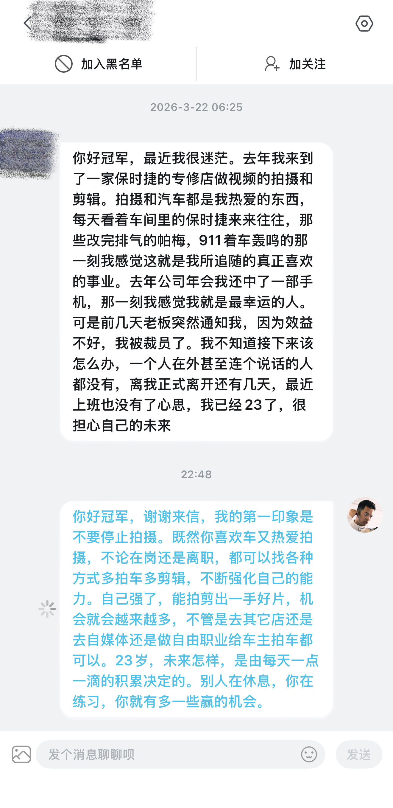 你好冠军,谢谢来信,我的第一印象是不要停止拍摄。既然你喜欢车又热爱拍摄,不论在岗还是离职,都可以找各种方式多拍车多剪辑,不断强化自己的能力。自己强了,能拍剪出一手好片,机会就会越来越多,不管是去其它店还是去自媒体还是做自由职业给车主拍车都可以。23岁,未来怎样,是由每天一点一滴的积累决定的。别人在休息,你在练习,你就有多一些赢的机会。