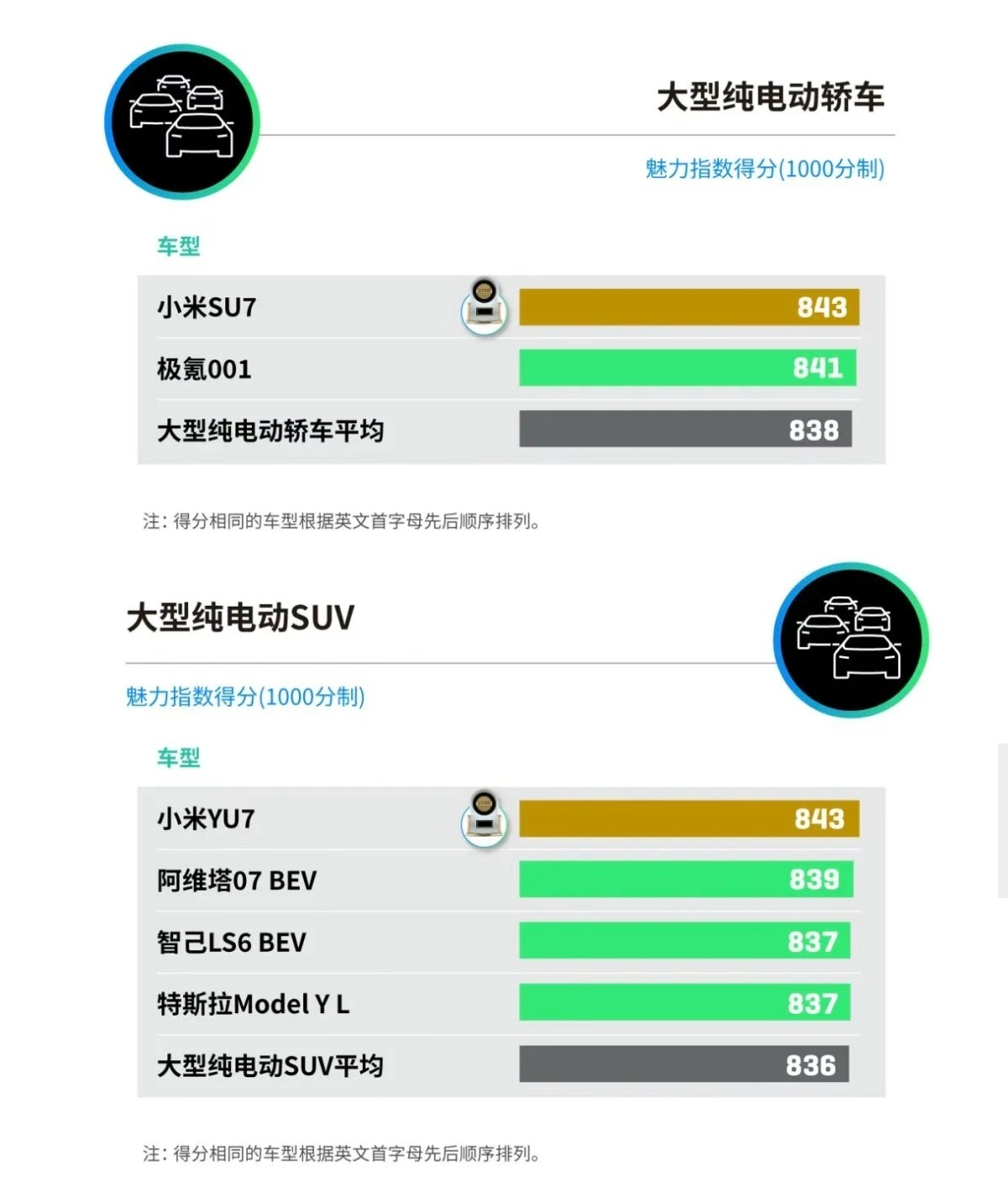 在这样的评比标准之下,小米SU7成为大型纯电轿车第一,小米YU7成为大型纯电SUV第一。