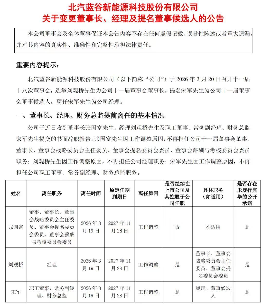 北汽蓝谷,董事长,再次发生变更(升任北汽股份董事长) - 张国富,2025年3月任职董事长,刚满12个月,原定任期为2027年11月 - 北汽蓝谷,上一任董事长,代康伟,任职时长仅8个月 张国富,后续将统管北汽股份与北汽蓝谷 - 北汽股份,手握北京奔驰、北京现代两大合资公司,外加北京越野品牌 - 北汽蓝谷,攥着享界和极狐两大新能源品牌【来自懂车帝车友圈】