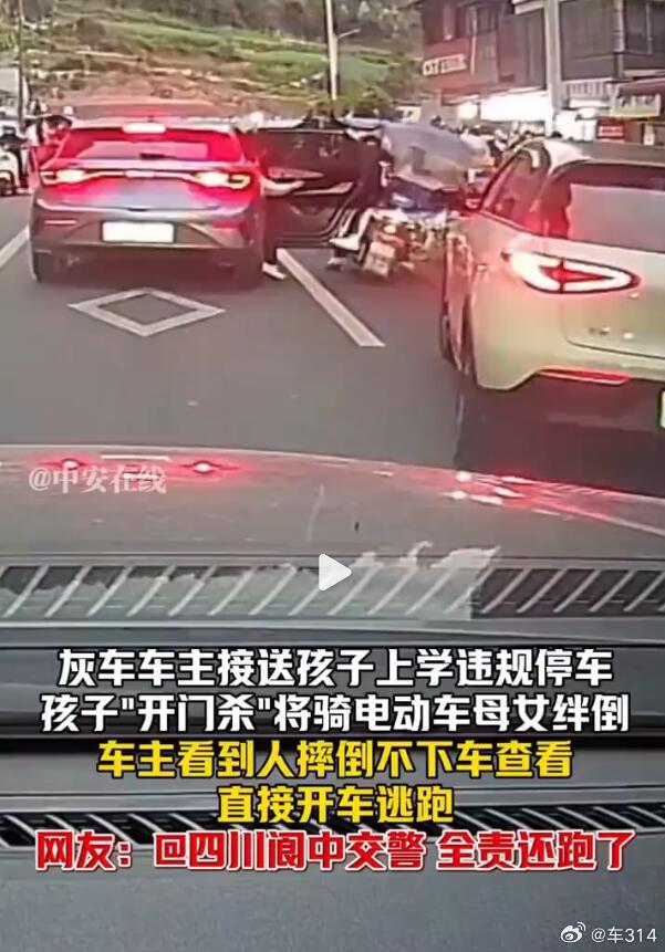家长在主路上违停,后排的孩子“开门杀”撞倒了旁边经过的电瓶车,结果孩子一眼都没看就走了,家长也光速逃逸。这种情况就是妥妥的全责,保险不赔的那种。这也确实是一家子坏种,影响了他人通行并造成了事故,还没有一丁点的歉意,车牌号川RDE3699大家看着办吧,估计这车主距离被开盒也不远了~家长违停孩子开门杀撞人后逃逸开门杀逃逸算不算肇事逃逸