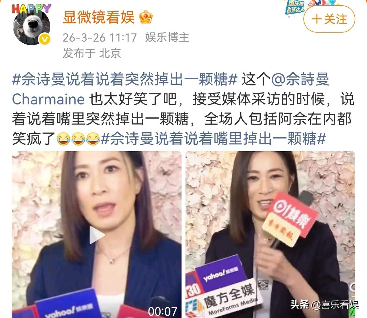 佘诗曼,让人笑麻了! 3月26日,阿佘这波操作直接让网友们都笑麻了。 原来,今日她在接受媒体群访的时候,正对着一堆话筒认真回答问题时,说着说着嘴里“啪嗒”掉出一颗糖,当场社死又好笑,全场包括她自己都笑疯了。 本来挺严肃的采访现场,突然一颗糖从嘴边滑出来,佘诗曼先是愣了半秒,然后自己先破功笑到眯眼睛。 而旁边举着话筒的记者们也跟着乐,这反差感真的绝了。 网友们看完也笑喷了,纷纷留言:“阿佘也太接地气了吧,采访还偷偷含颗糖”“这糖是想抢镜当主角吗”“谁懂啊,像极了上课偷吃糖被抓包的我”。 其实,佘诗曼一直都没什么明星架子,平时在剧里是气场全开的大女主。 私下里却是这种会偷偷藏糖、还能在采访时掉出来的可爱姐姐,完全没有偶像包袱。 真的,有时候明星这种没预谋的小意外,反而比刻意营业更圈粉。 一下子就从遥不可及的明星,变成了身边那个爱偷吃小零食的可爱朋友,谁能不爱啊!
