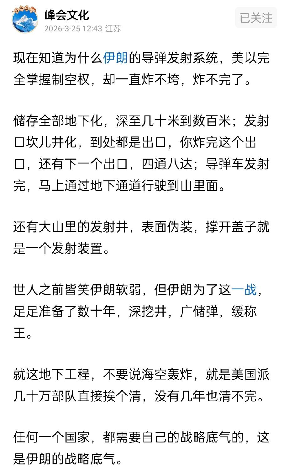 美伊战争表明,数十年过去了,毛泽东军事思想指导国际反霸斗争依然管用。 一、众志成城,坚定斗争到底的信念,在武器装备等物质条件相对落后的情况下,小国能打败大国,弱国能战胜强国。 二、在精确制导钻地弹药广泛使用的今天,军事设施地下化仍意义重大,能确保国家反击力量不被轻易摧毁,令帝国主义者忌惮三分。 三、自己要行得正,不称霸不对外扩张。海湾战争伊拉克惨败,固然有军力远逊美国的因素,事前侵吞主权国家科威特,也导致自己失道寡助。
