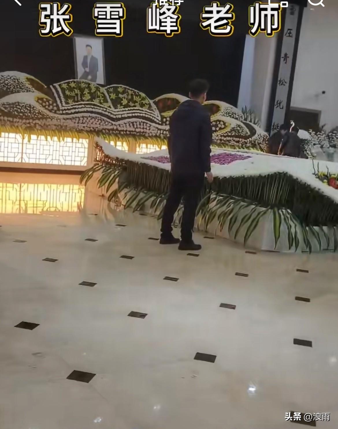 张雪峰追悼会的现场布置基本完成。 黑色背景墙上挂着张雪峰身着西服的遗像。 遗像下方是用鲜花制作的书本造型,象征着张雪峰从事的教育行业。 遵照他生前的遗愿,整个现场布置的简约简单,给人素雅清静的感觉。 一侧挽联写道:雪压青松犹挺直。正是张雪峰百折不挠,坚韧不拔品格的写照。