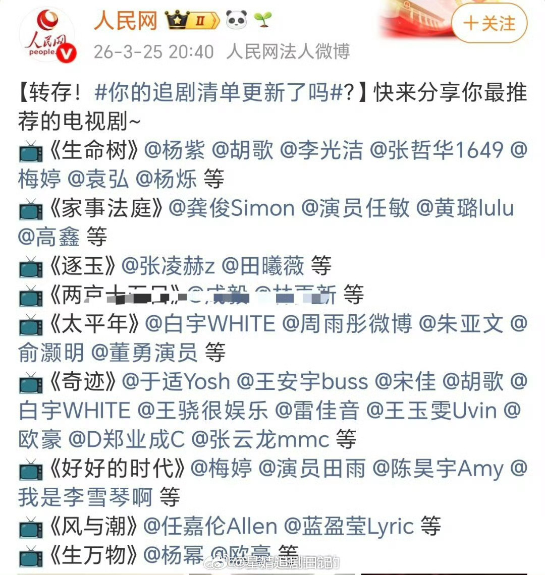 人民网发的追剧清单:生命树 家事法庭 逐玉 太平年 奇迹 好好的时代 风与潮 生