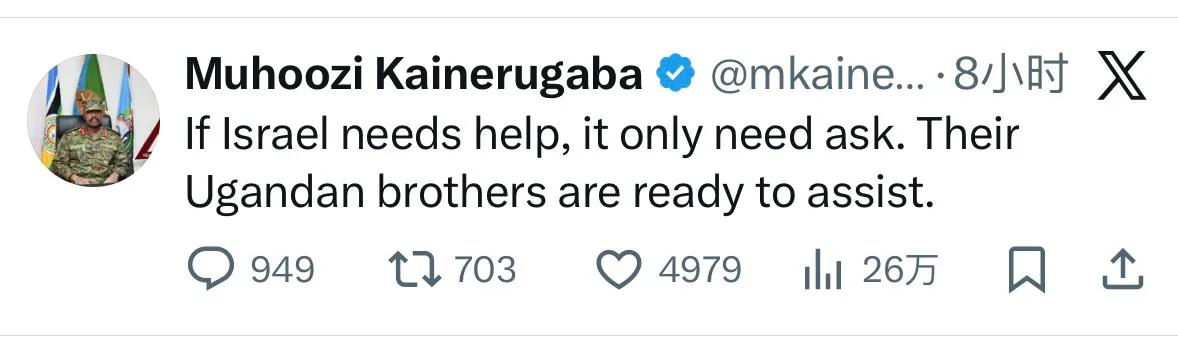乌干达陆军司令穆胡齐·凯内鲁加巴今天发文称:“如果以色列需要帮助,只需开口,他们的乌干达兄弟已准备好提供协助。” 凯内鲁加巴是乌干达总统的儿子。此推文发表后迅速引发关注,目前已获得2600万次浏览。 此番表态凸显了乌干达与以色列之间长期存在的军事和安全合作关系。乌干达军队在过去曾与以色列有密切的训练与装备交流。 上个推文后,凯内鲁加巴又再次发文写道:“上世纪八九十年代,当我们还是无名小卒时,以色列与我们站在一起。如今我们的GDP已达1000亿美元,位列非洲前茅,我们为何不捍卫她呢?” 以色列总理内塔尼亚胡的哥哥乔纳森·内塔尼亚胡早年在乌干达解救人质行动中阵亡,乌干达即将在恩德培国际机场揭幕他的塑像以纪念这位英雄。 乌干达兄弟还是重情谊的。